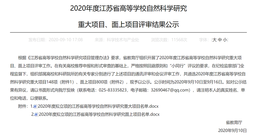 9月10日,江苏省教育厅公布了2020年度省高等公司自然科学研究重大项目、面上项目评审结果公示清单,公司冯学良博士的《江苏省北部地区作物地上生物量估算遥感方法研究》和张春雷博士的《重复扰动下煤岩组合体裂隙网络分布特征及瓦斯渗流规律》获面上项目立项。