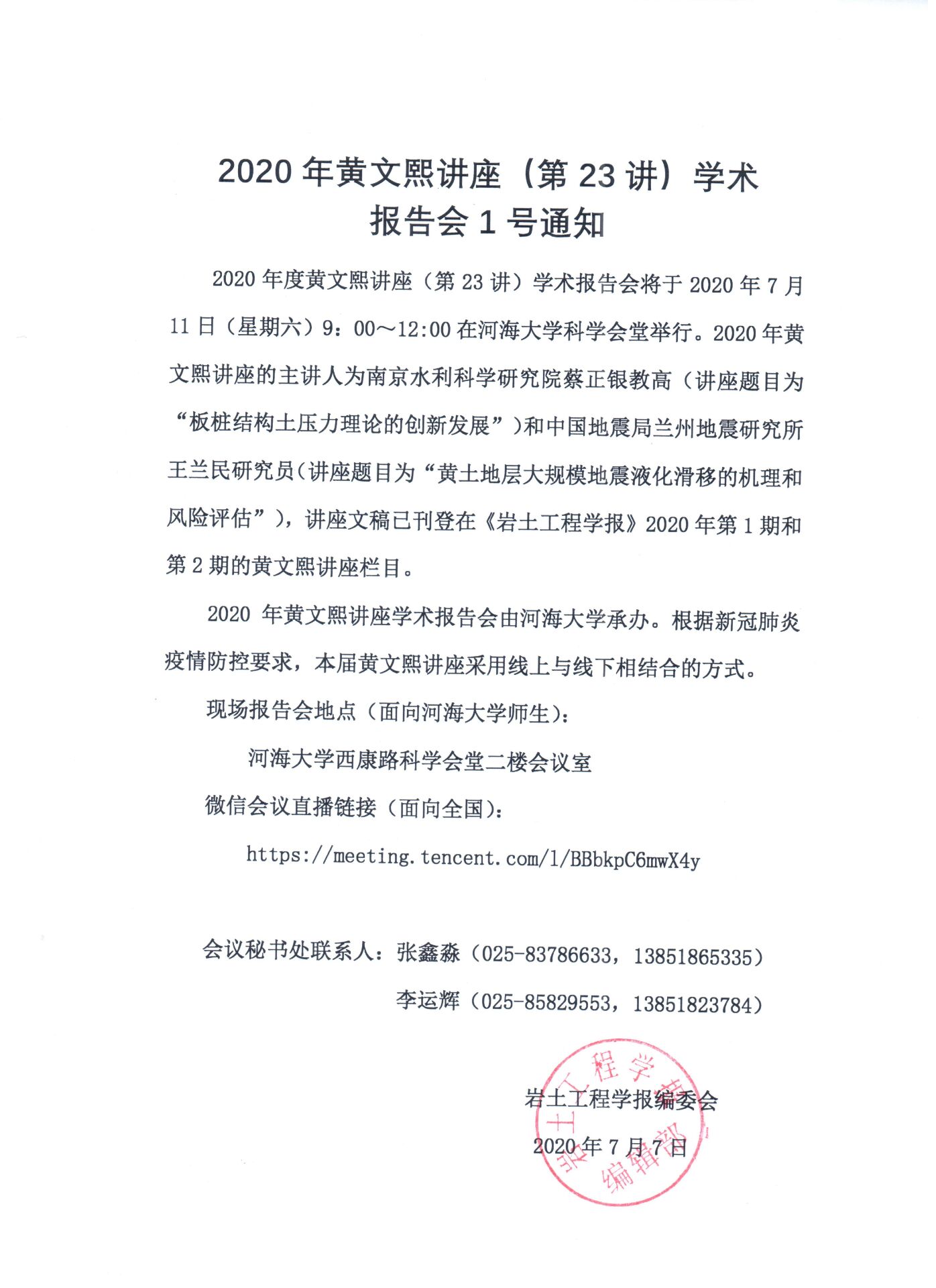 2020年黄文熙讲座(第23讲)学术报告会1号通知