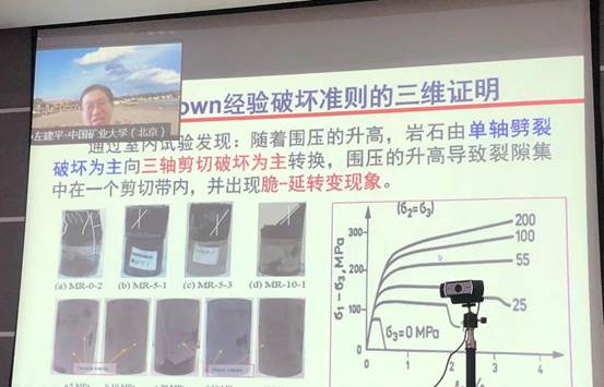 报告会上,左建平教授首先简要介绍了中国矿业大学(北京)矿山工程力学发展历史,简练而精准的归纳了云顶国际8588yd与矿大力学与云顶国际8588yd的共通之处,令人如沐春风,倍感亲切;接着左教授简要介绍采矿工程中的力学问题,如顶板断裂是固体破坏力学问题、煤与瓦斯突出是气固耦合问题、突水是流固耦合问题;冲击地压是岩石动力学问题等,左教授深入浅出的介绍引来全场广泛共鸣。最后,左教授详细介绍了其团队近期的研究工作—采矿岩石多尺度破坏力学与岩层控制,主要讨论了岩石破坏理论工作-理论证明Hoek-Brown准则(小尺度)、岩层移动工作-建立了厚松散岩层移动类双曲线模型(大尺度)、围岩控制工作-提出了深部巷道等强支护理论及全空间协控制技术(中尺度)三个方面内容,并引发线上线下参会人员的热烈讨论。