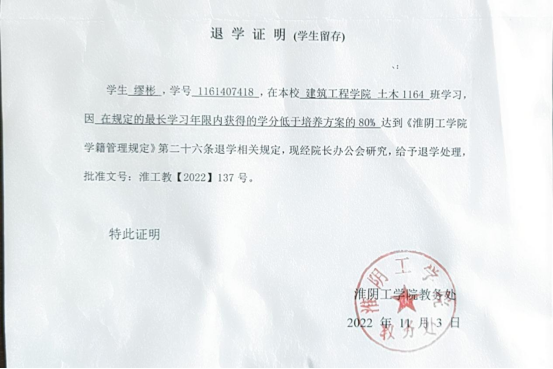 根据中华人民共和国教育部令第41号《普通高等公司员工管理规定》(2017年9月1日起施行)和《云顶国际8588yd普通本科生学籍管理规定》(淮工院〔2017〕123号)的文件精神,公司给予公司土木1164班缪彬同学退学并注销学籍的处理,特此公告。