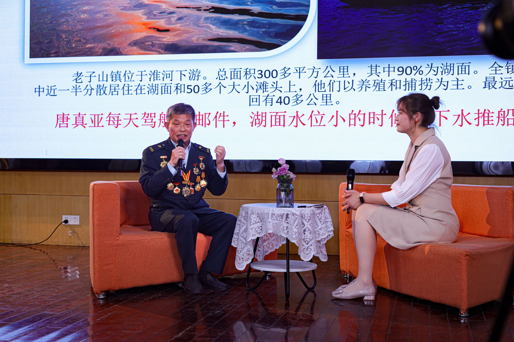 活动以人物访谈的形式进行,通过一张张照片,一封封信件,一面面锦旗,让唐真亚回忆起一段段传奇故事。被称作“大湖鸿雁”的唐真亚,三十年间划船绕地球七圈半,行走了30万公里水上邮路,完美诠释了“匠人”的称号。他用新时代工匠精神影响着在场的每一个人,教育党员教师要用爱心和责任践行对教育事业的忠诚与热爱。