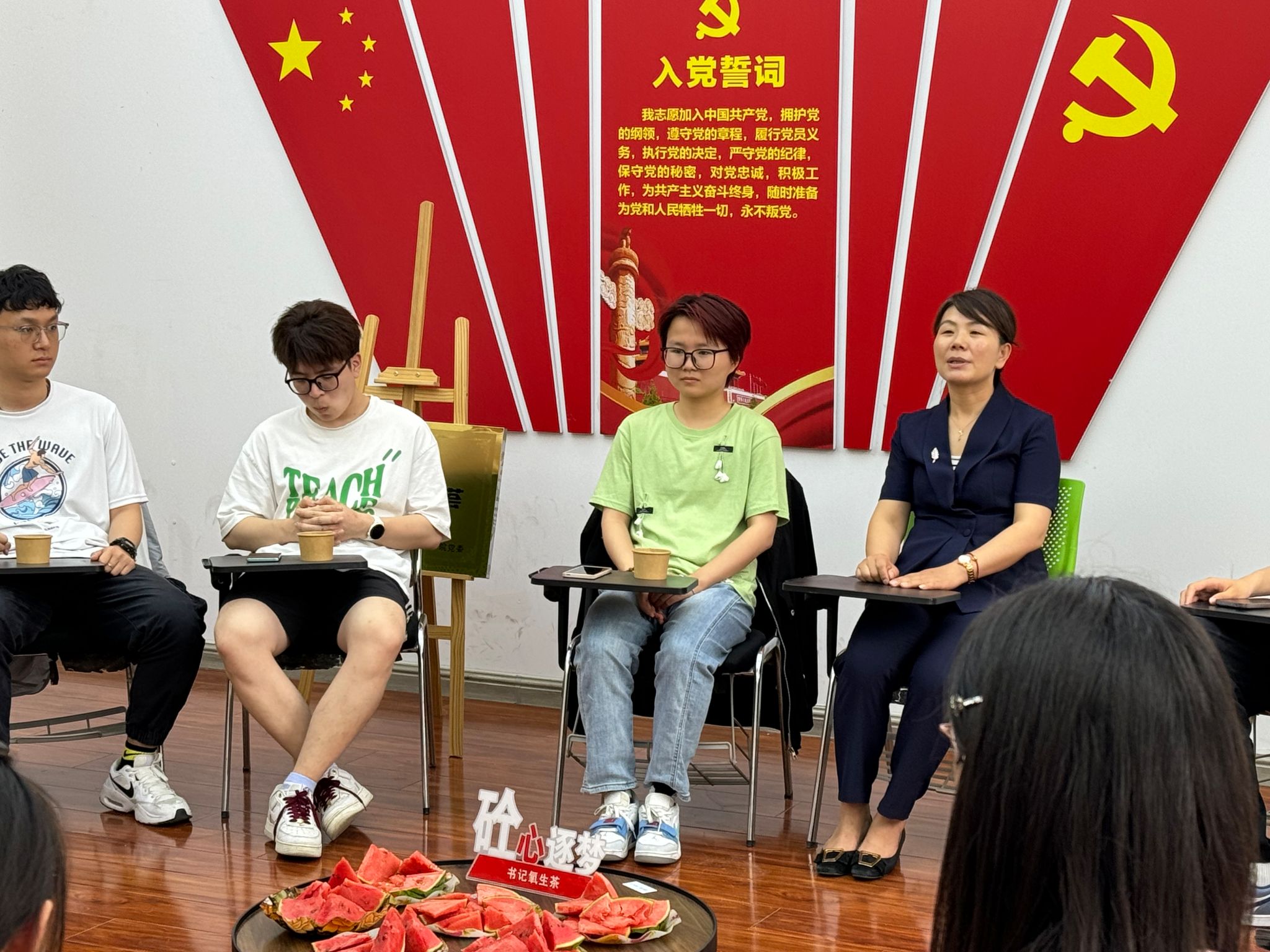 活动开始时,大家有序落座,每个人的桌板上放着夏雪芹精心熬制的“氧”生茶。本次“氧”生茶中有夏雪芹特意根据人数放入的大枣、莲子等,活动室中心的圆桌上放满了刚切好的本地西瓜。