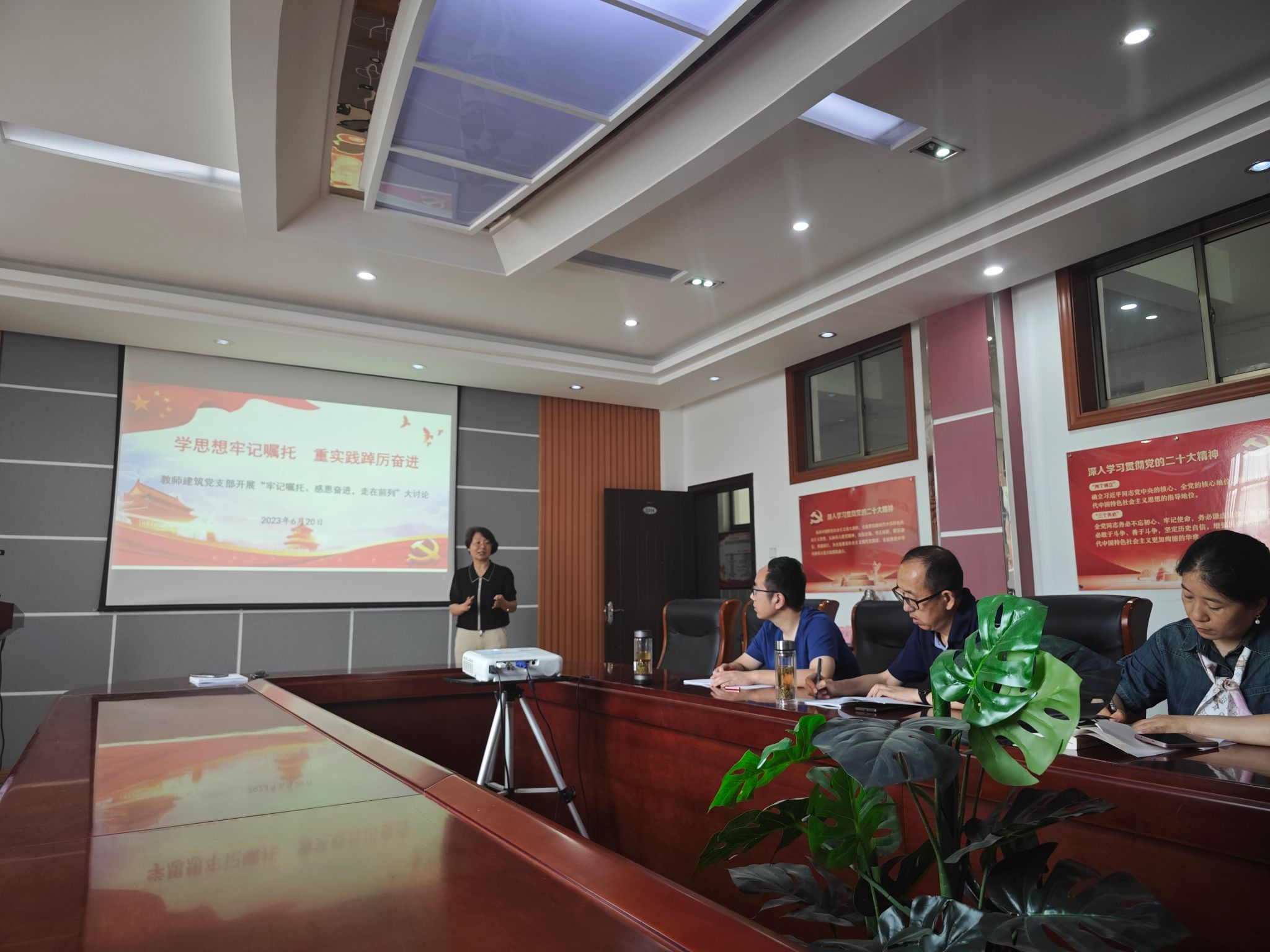 2023年6月20日下午,教师建筑党支部在品学楼3316会议室开展“牢记嘱托、感恩奋进,走在前列”大讨论,活动由支部书记罗雅丽主持,周潮副经理及支部党员参加大讨论。