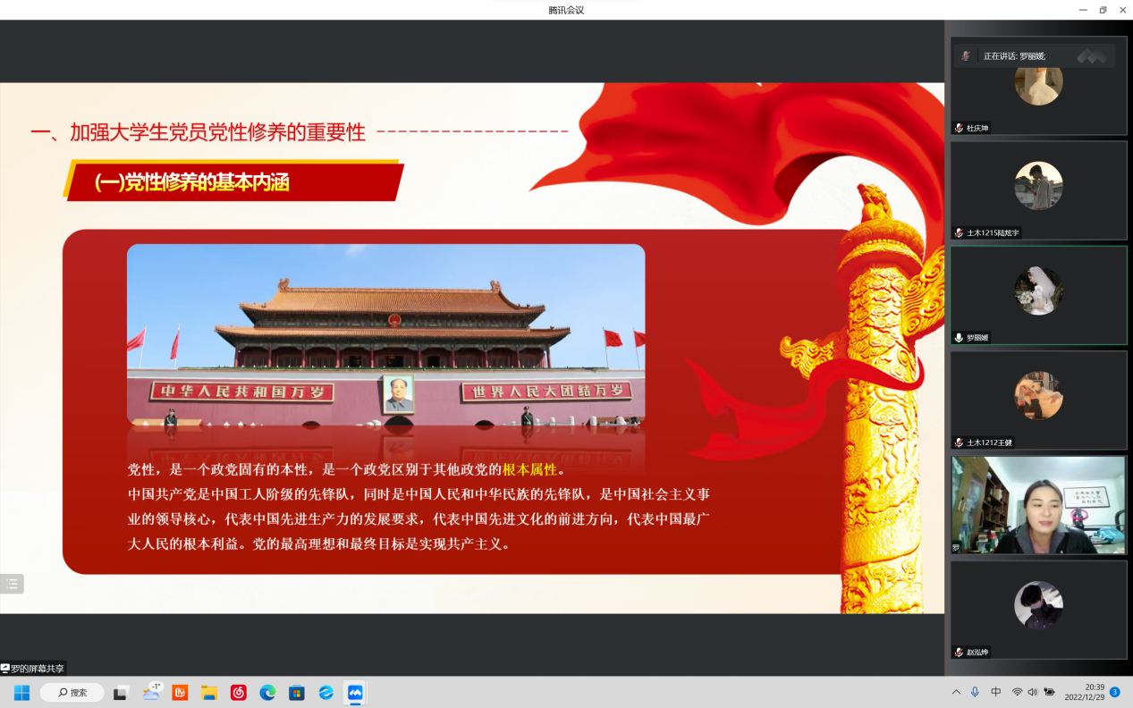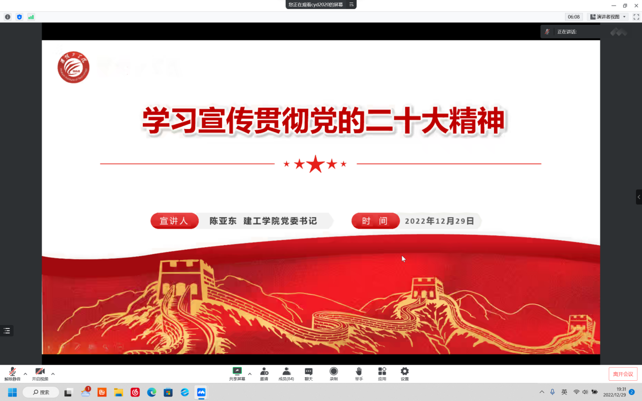 陈亚东老师以党的二十大为主题,向学员介绍了党的二十大精神及内涵,并提出要始终坚持党的领导,坚持为党和人民事业服务,做传承红色基因的中国青年。