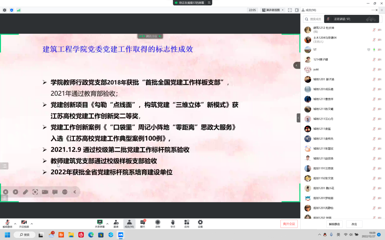 12月27日至30日,建工公司党委举办了2022年度第二期入党积极分子培训,分别由唐善婷、孙雨桐、王启松、顾向阳、罗丽媛、陈亚东、张涵、佘跃心老师主讲,依托腾讯会议进行授课,公司100名入党积极分子参加了本次培训。