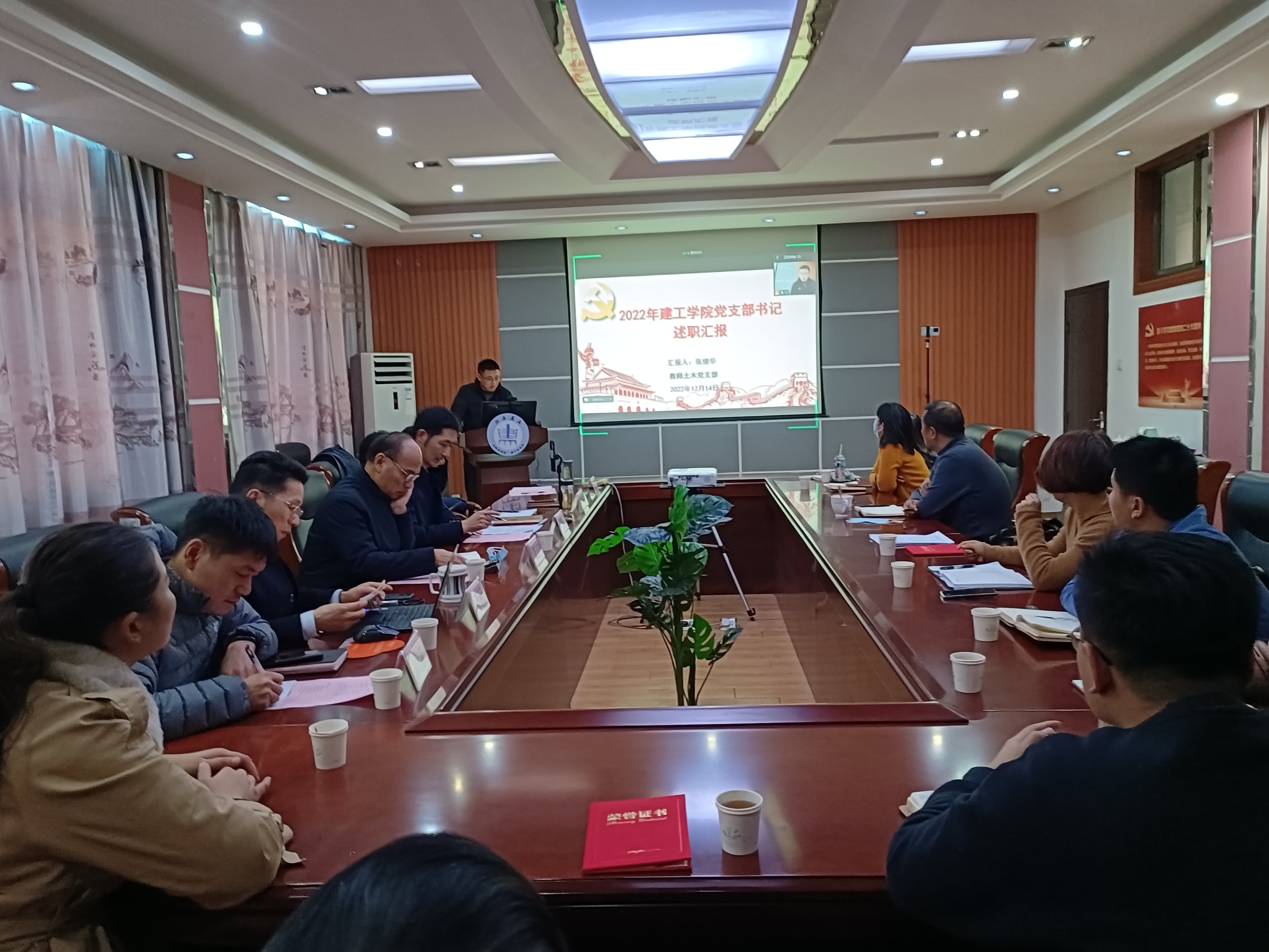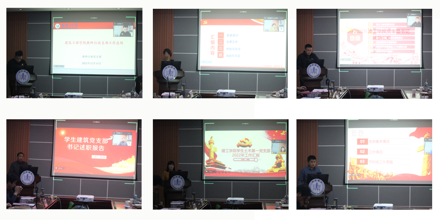 建工公司党委教师行政支部、教师建筑支部、教师土木支部、员工建筑支部、员工土木第一支部、员工土木第二支部书记依次汇报2022年度支部建设成效,剖析支部建设存在的不足,明确改进计划和举措,积极推进“品牌化”党支部建设。