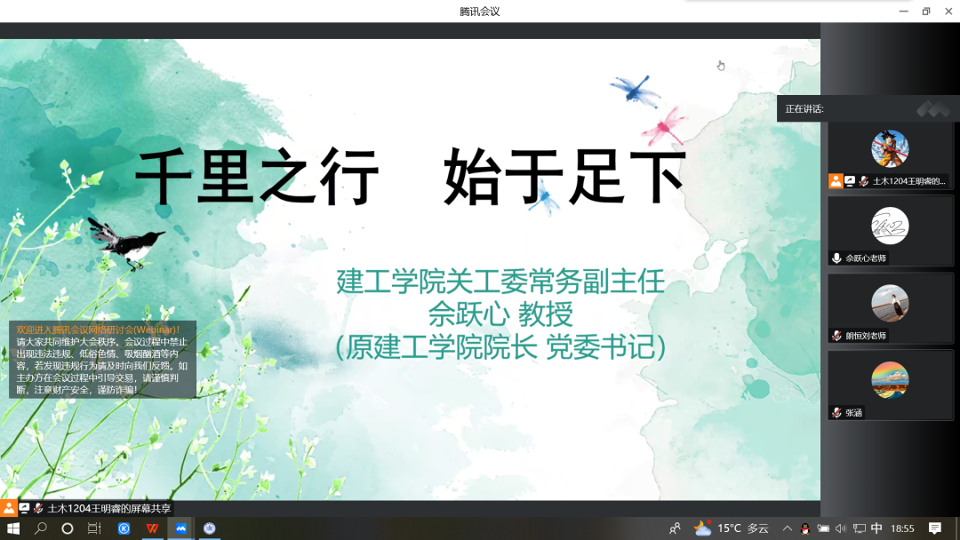 在公司开展“践行恩来精神 塑造优良学风”学风重点建设月活动之际,云顶国际8588yd于11月3日晚7点邀请公司关工委常务副主任佘跃心教授作“千里之行 始于足下”学风建设主题报告会,报告会由2020级辅导员张涵主持,2020级全体员工参加了会议。