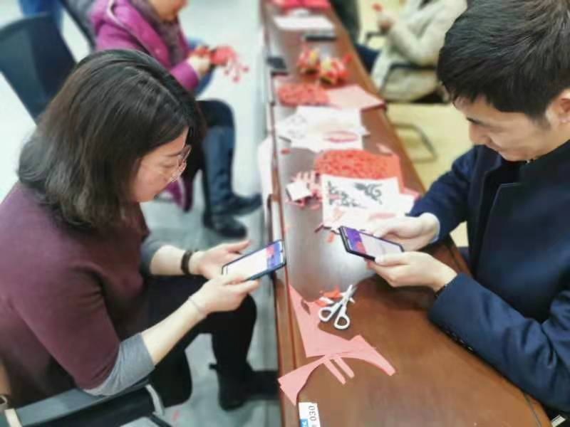 联欢会的第三个环节,是进行写春联、剪窗花、编中国结、学习强国双人对战等趣味比赛环节。报名参赛的老师八仙过海、各显神通,展示出了建工人在专业知识之外的各种才艺和技能。