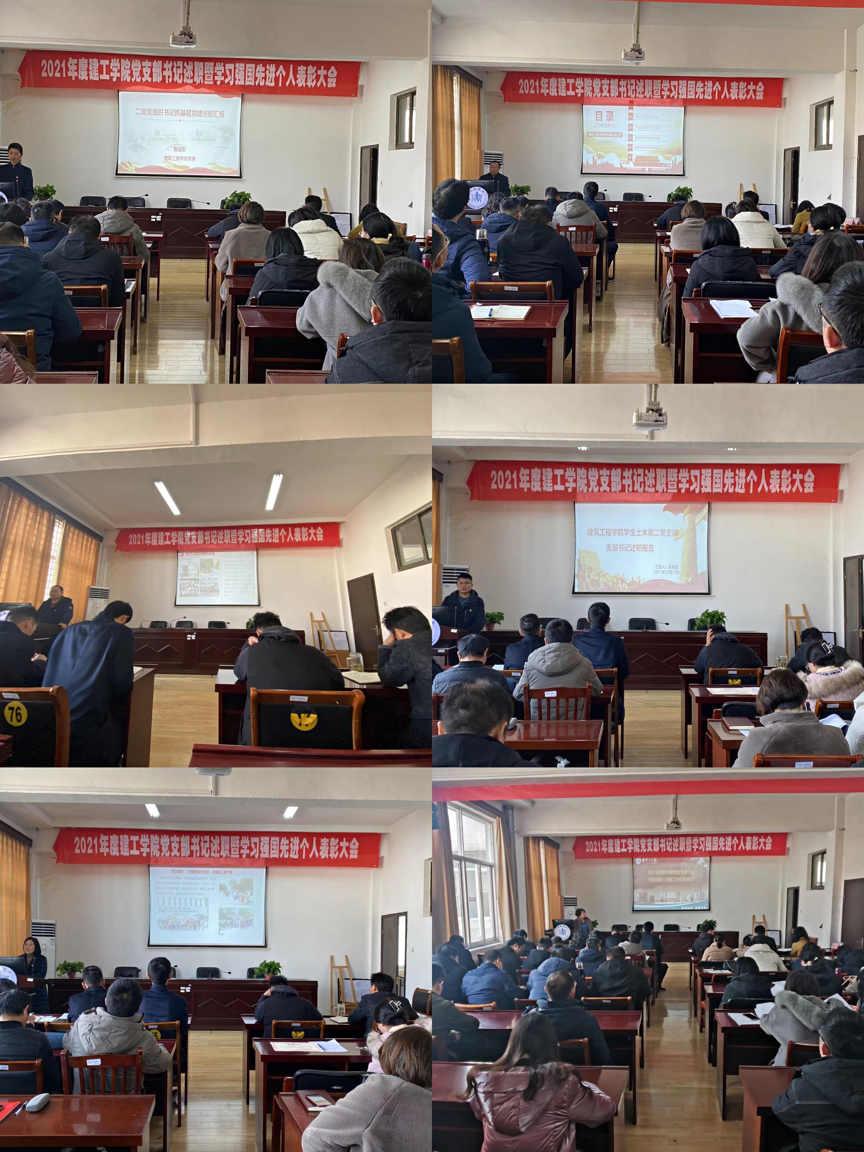 会上,教师行政党支部、教师建筑党支部、教师土木党支部、员工建筑党支部、员工土木第一党支部、员工土木第二党支部、员工土木第三党支部书记依次述职,从执行上级党组织决定、严格党的组织生活制度、加强党员教育管理和服务群众、加强支部班子自身建设、党史学习教育、特色亮点作法七个方面汇报2021年度支部各项工作的开展情况、取得成效、存在不足和工作展望,全面系统汇报党支部书记履职情况。