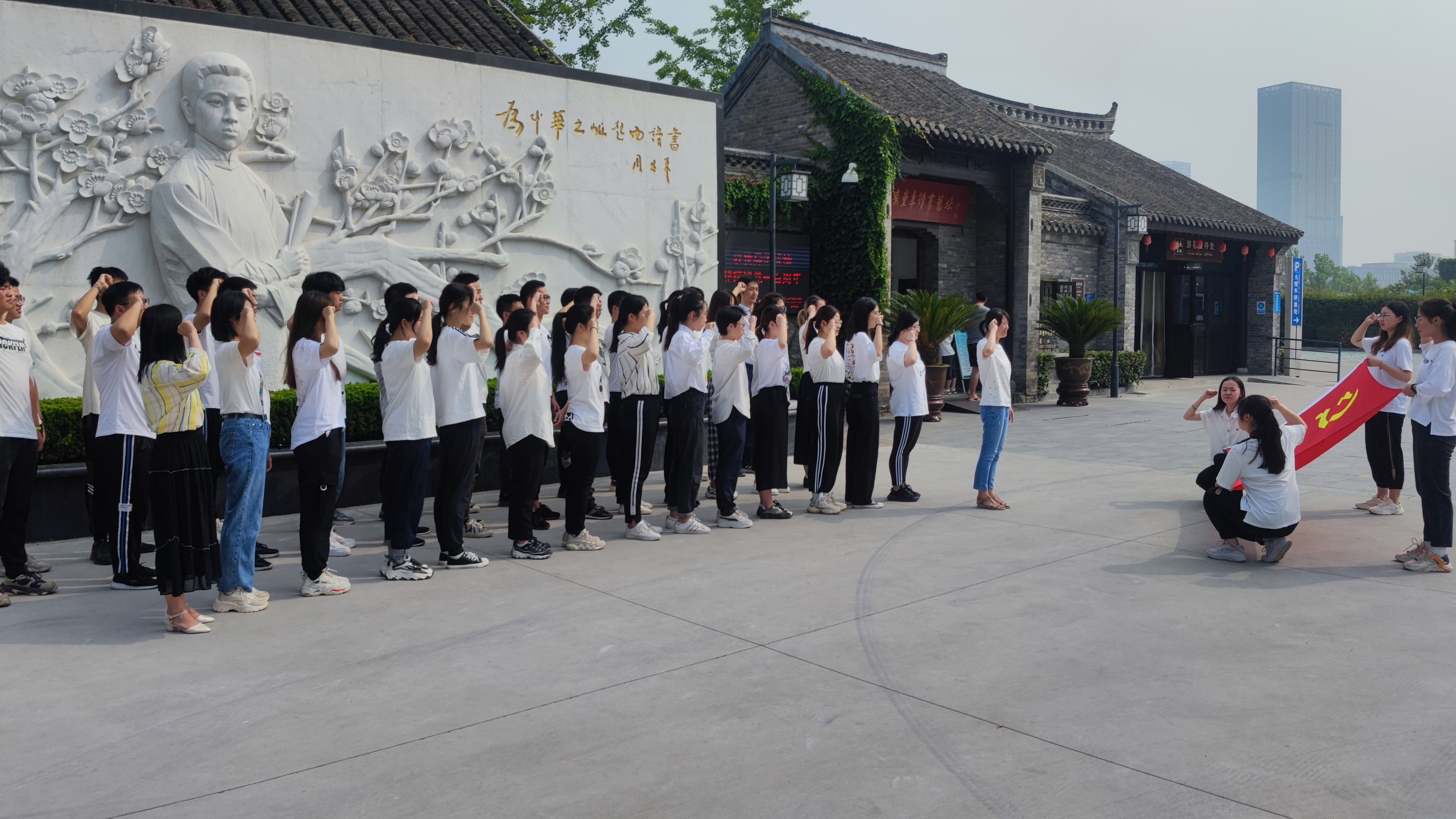 在周恩来童年纪念广场汉白玉浮雕墙前,全体党员面向鲜红的党旗举起右手,满怀敬仰之心地庄严宣誓:“我志愿加入中国共产党,拥护党的纲领,遵守党的章程……”。铮铮誓词作行动标尺,坚定理想信念,勇担时代使命。
