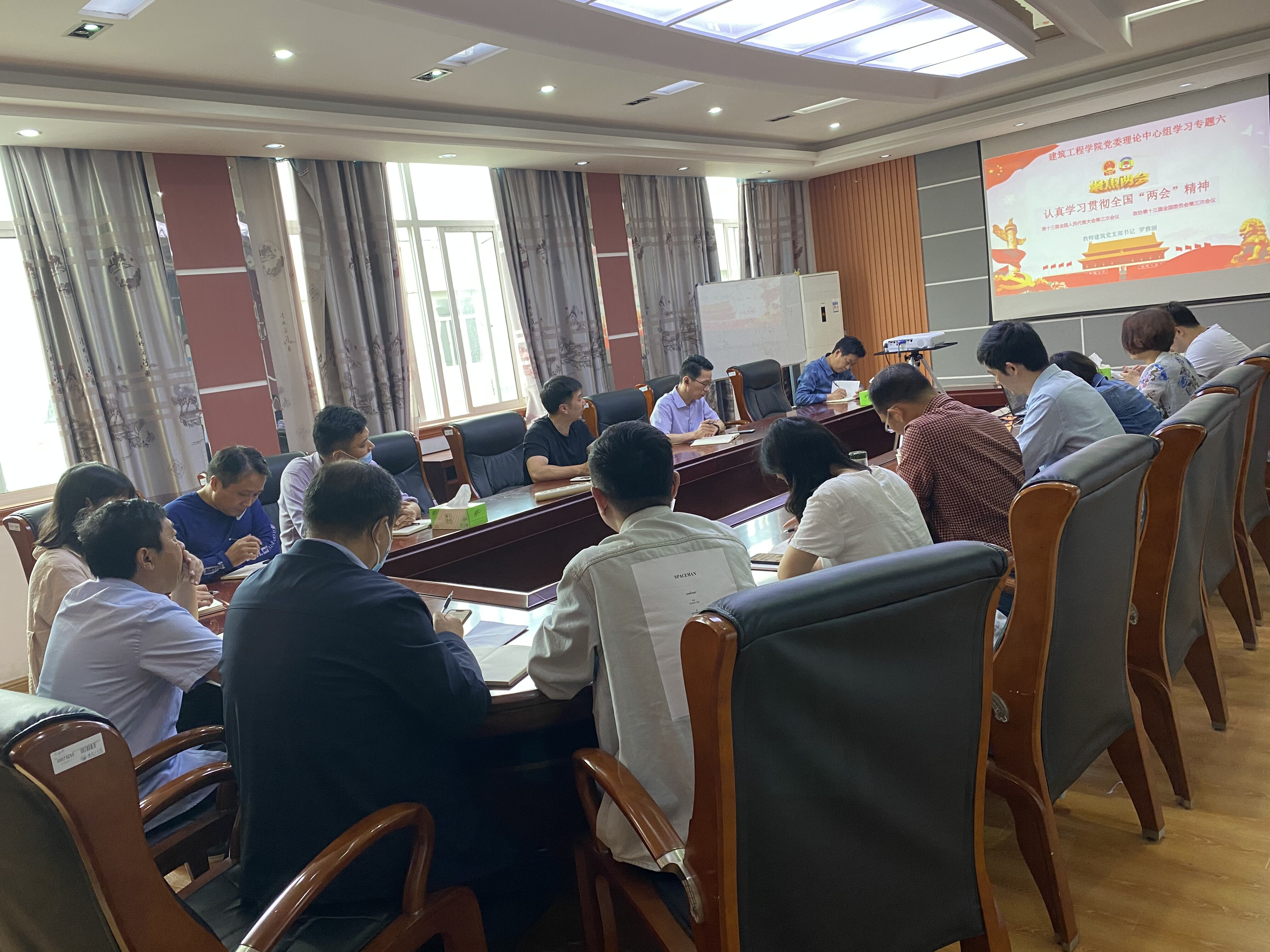2020年6月17日15点,建工公司党委理论中心组在品学楼3316室进行2020年第6次集中学习,专题内容为《认真学习贯彻全国“两会”精神》,会议由公司党委书记韩飞主持,重点发言人是教师建筑党支部书记罗雅丽博士和实验室副主任朱鹏宇老师。