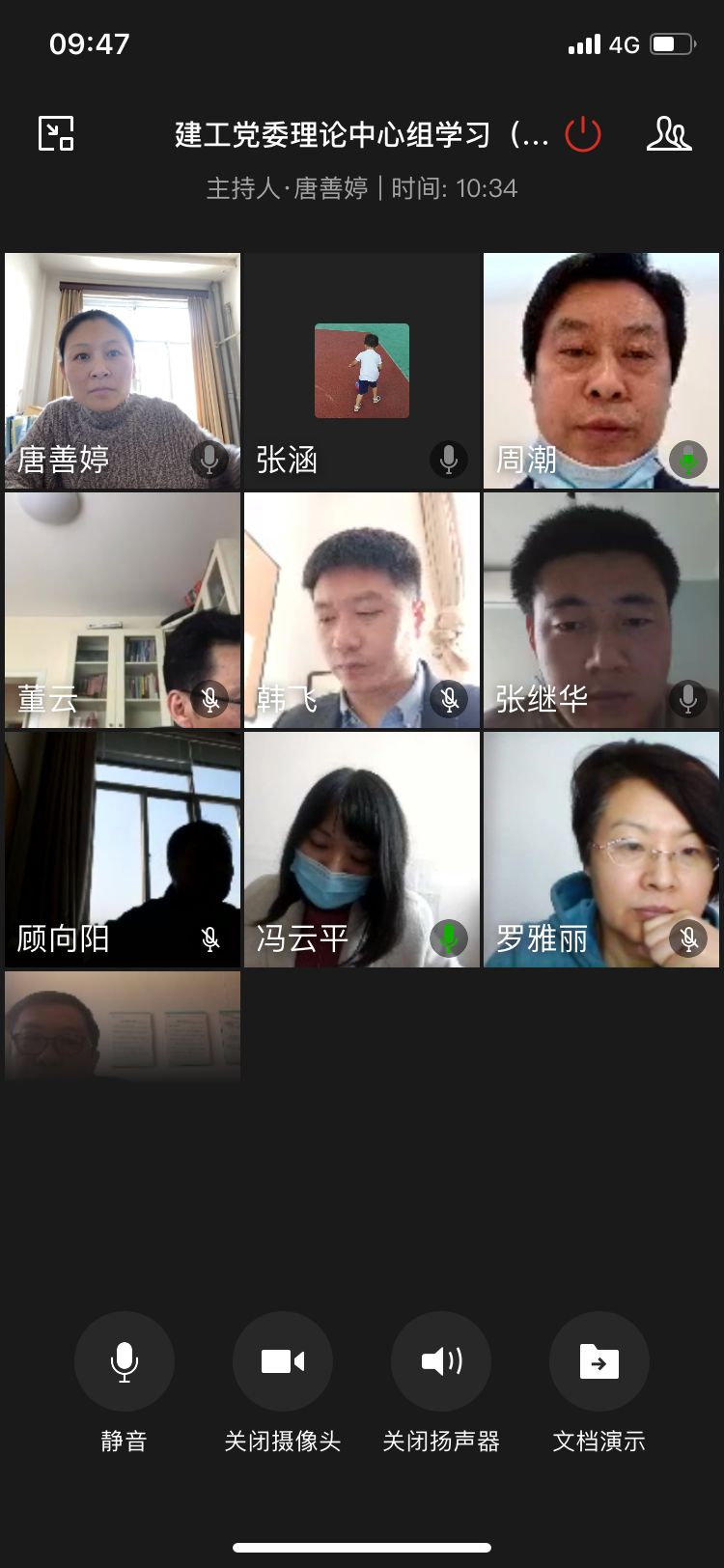 2020年4月28日上午9点40分,建工公司党委理论中心组利用企业微信视频会议进行2020年第2次集中学习,通过线上方式学习习近平总书记关于打赢新型冠状病毒疫情防控的系列论述,会议由公司党委书记韩飞主持,本次专题学习重点发言人为教师土木党支部书记张继华和学工办主任冯云平。