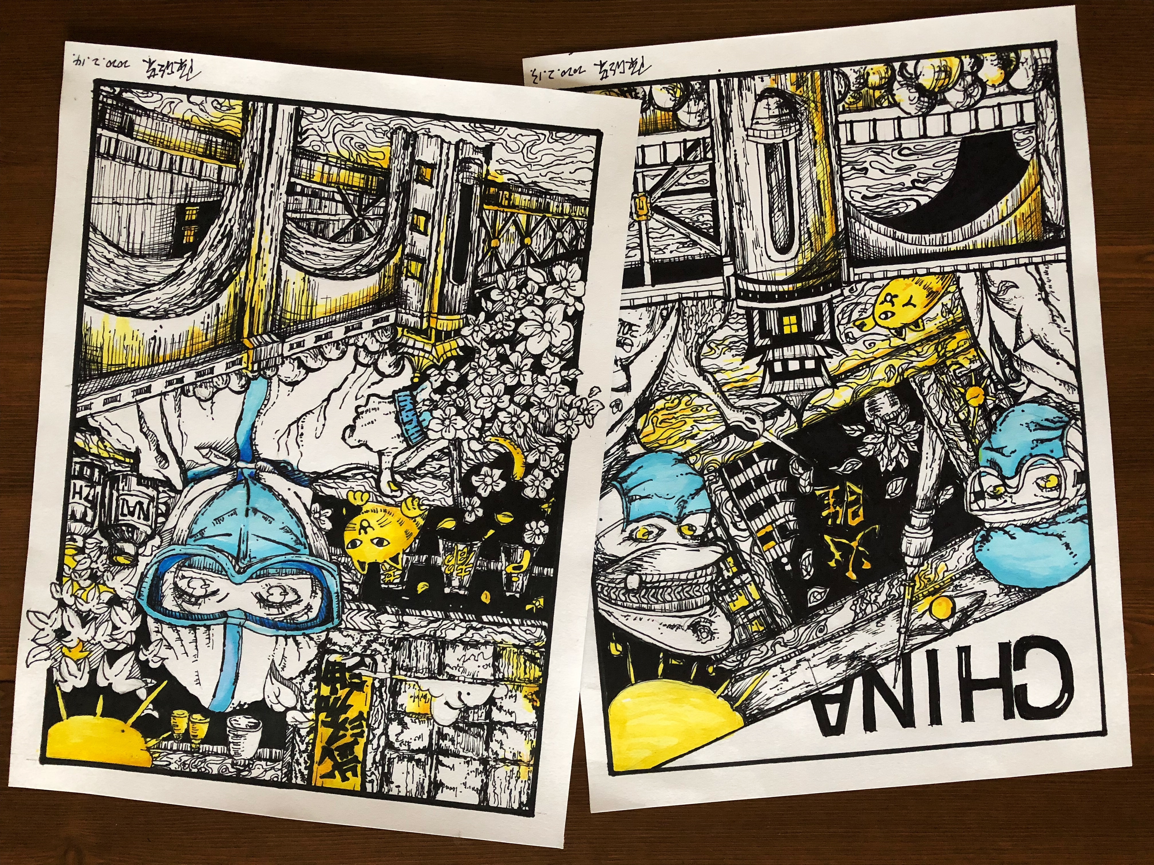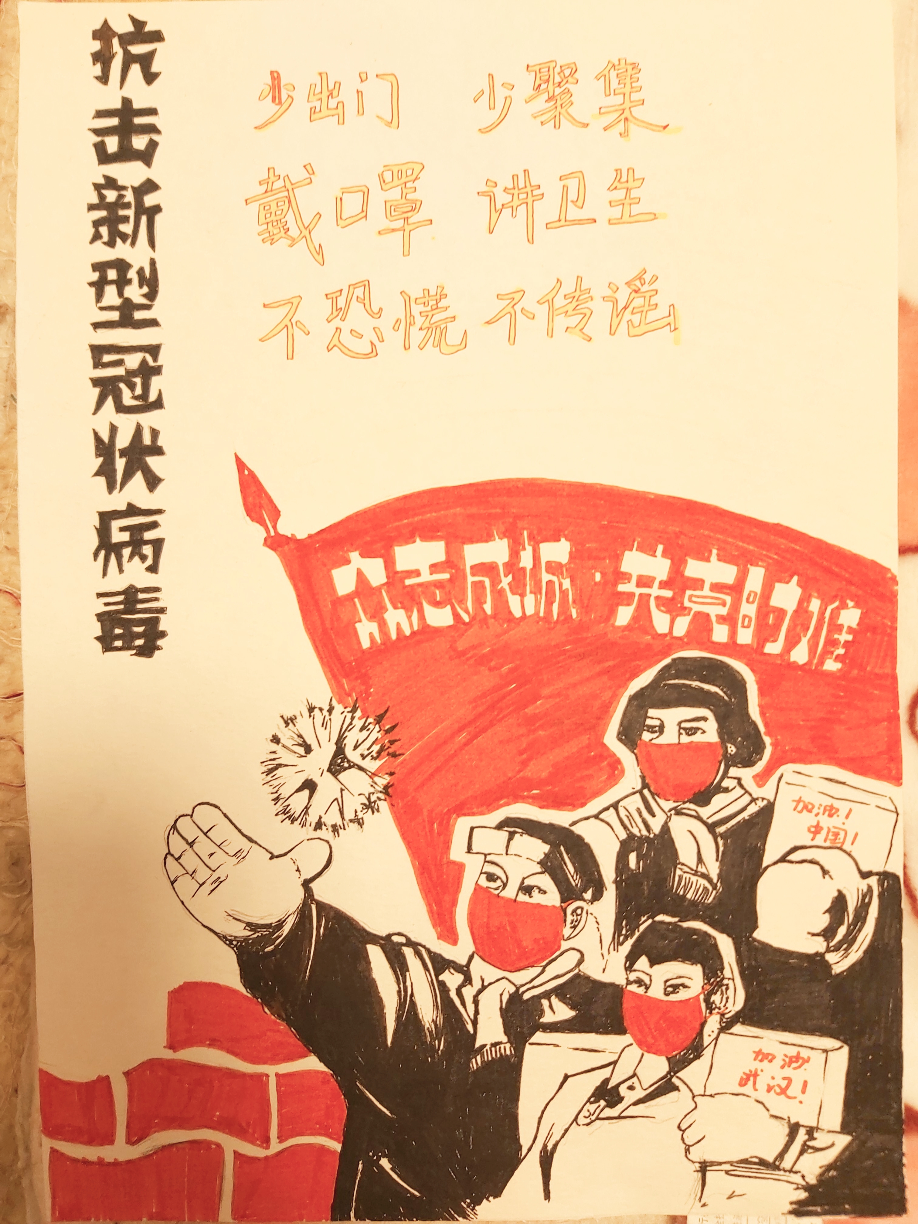 全体师生党员书写了战胜疫情的感悟,分享了“战疫”感悟。员工建筑支部的员工党员还以手绘手抄报的方式表达自己的战疫感悟,员工党员陈欣荣的将建筑手绘与奋战在抗疫一线的医生、警察等职业形象相融合绘制成抗疫手抄报;预备党员胡海欣以上世纪九十年代的画报风格宣传战疫口号。