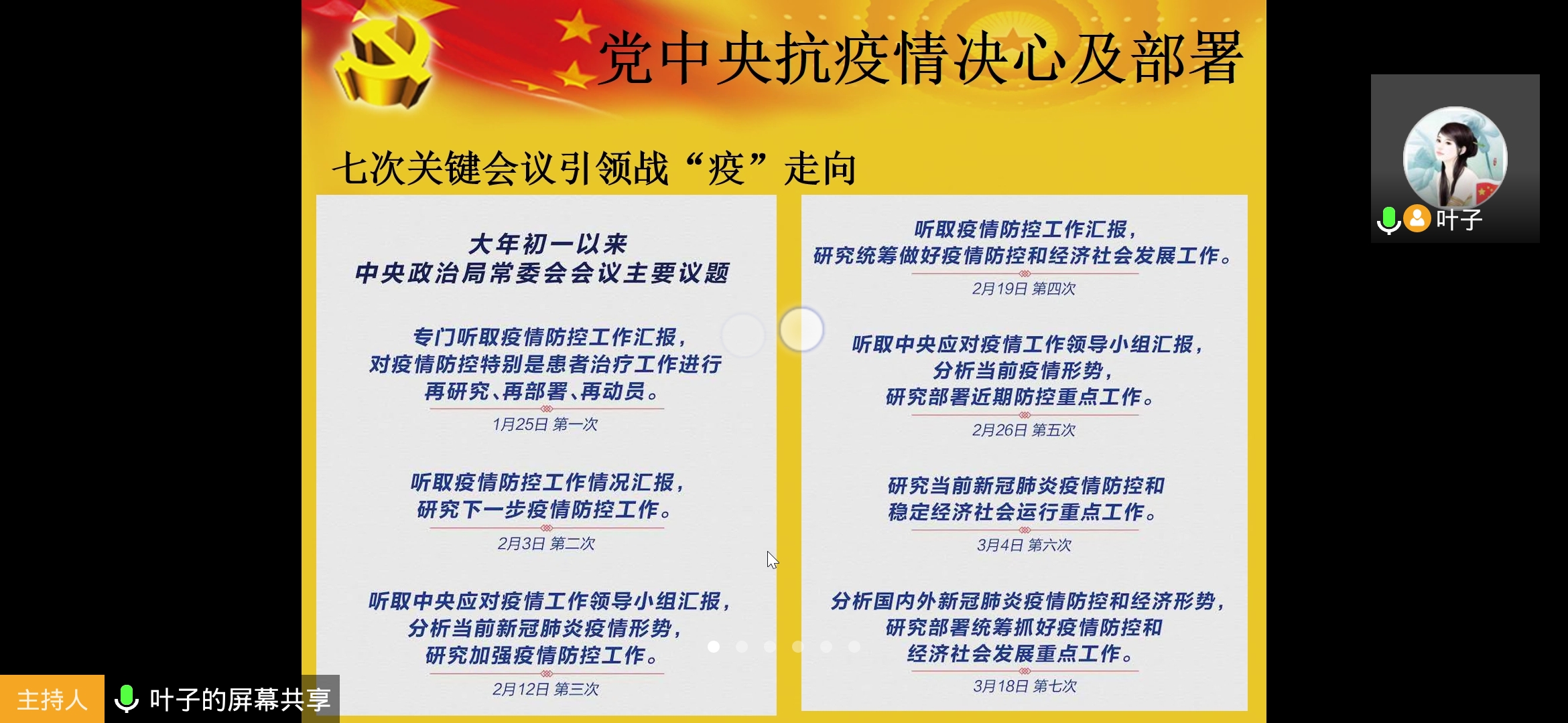 “同心抗疫情,党员勇担当”线上主题党日活动,既是贯彻落实党员教育管理常态化的举措,又充分发挥党组织的战斗堡垒作用和党员先锋模范作用。主题党日活动中,提升了党员教育实效性,鼓励引导全体师生进一步凝聚思想共识,时刻谨记“疫情就是命令,防控就是责任”,勇于亮明党员身份,勇于承担,践行承诺,做到“守土有责、守土担责、守土尽责”。