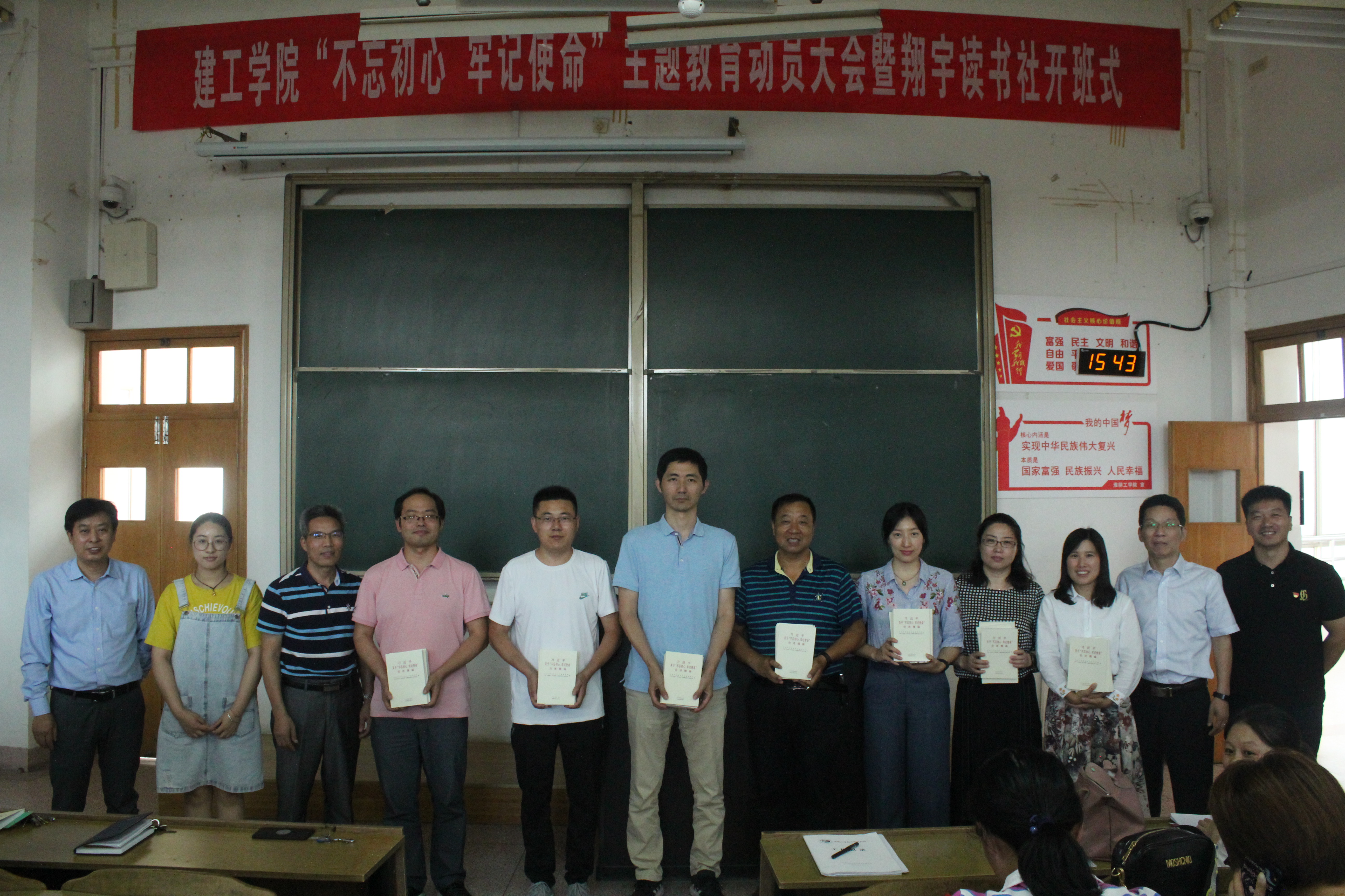翔宇读书社开班式上,校第三指导组张元华、王慧和云顶国际8588yd领导班子一起为各党支部书记赠书。