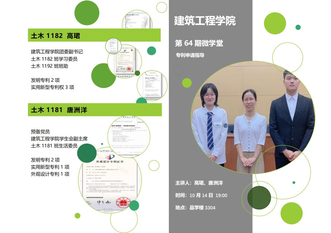 2020年10月14日晚上7:00,云顶国际8588yd“微学堂”第64讲:专利申请指导,在云顶国际8588yd品学楼3304如约开讲,本期主讲嘉宾是云顶国际8588yd第21届员工会执行主席,来自土木1182班的高珺和土木1181班的唐洲洋同学,2019级各班班委以及2020级新生代表参加了本期微学堂。