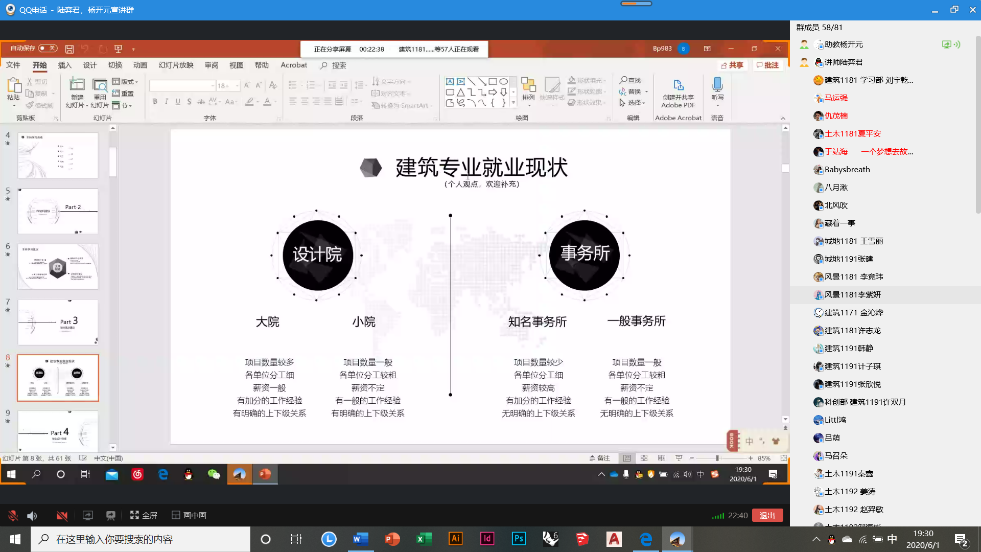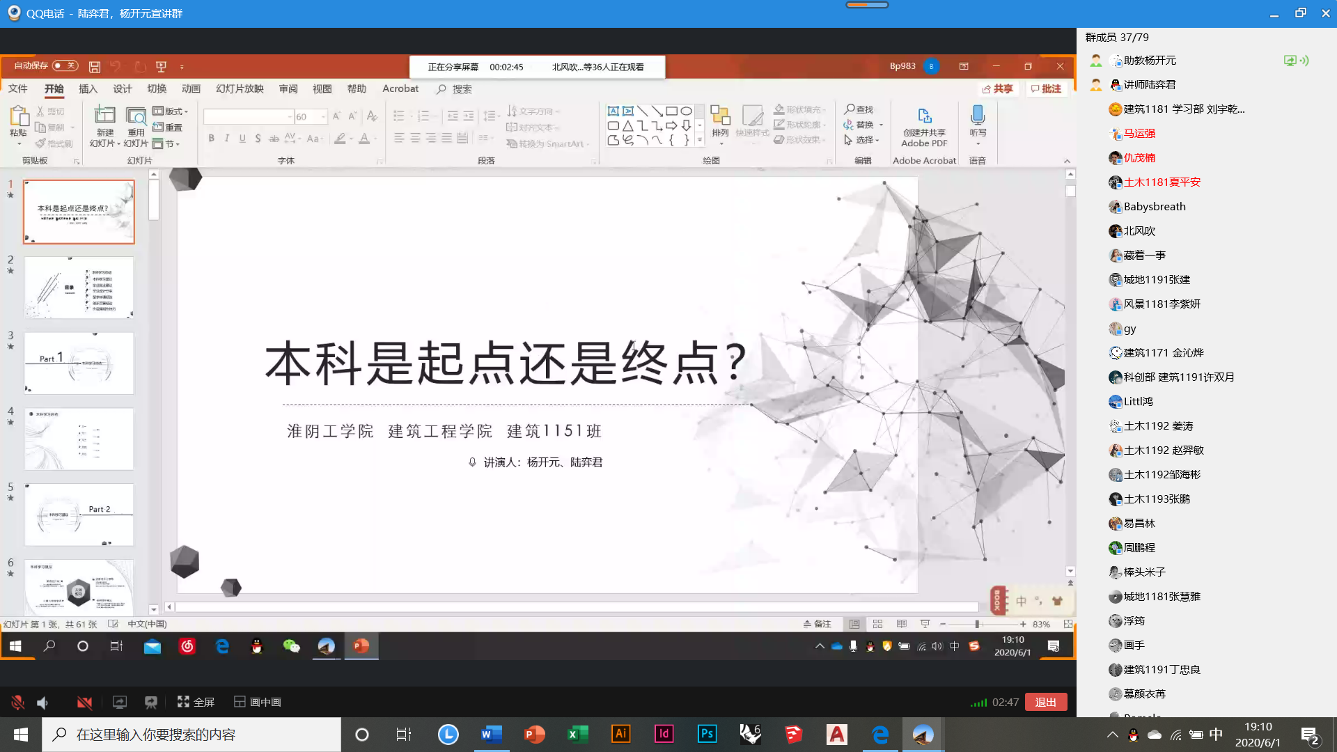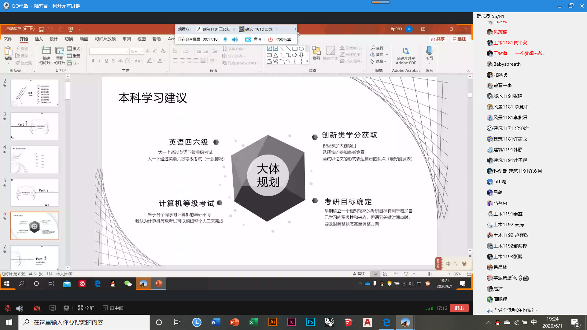 2020年6月1日下午7时,云顶国际8588yd第60期微学堂:学霸情侣的奋斗人生借助腾讯会议采取线上模式如期开讲。本期微学堂的主讲人是分别被国外知名大学录取的2015级建筑学杨开元同学和陆弈君同学,2016级、2017级备战考研的同学参加了本期微学堂。