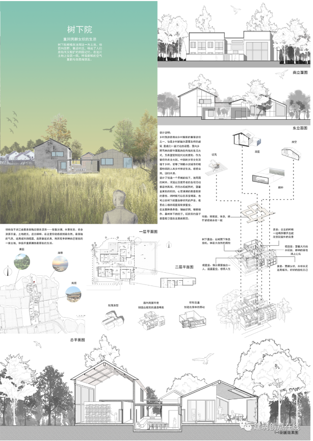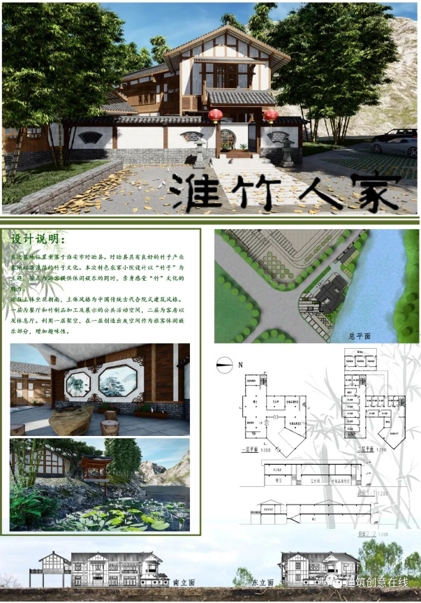 “特色农家小院”创意设计竞赛,根据截止到6.5日的线上投票和线下评比,由建筑学专业的毛胤杰提交的作品“树下院”获得本次竞赛的特等奖,凌晓月等同学提交的作品“淮竹人家”、周奕轩等同学提交的作品“渔樵人家”分别的一等奖和二等奖。