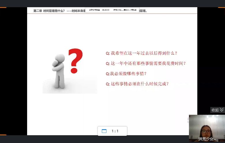 本期课程主题是《告别瞎忙:疫情期间的时间管理》。陆老师首先提出了为什么要学会时间管理,指出时间管理的本质是自我管理。其次引出管理好时间的方法,告诫同学们用最高的效率去做最有意义的事情。最后用青蛙举例FAST原则的学习法,第一是吃青蛙,第二是行动清单,第三是拆解青蛙,第四是时间感知,告知同学们要以青蛙自喻,找出适合自己的的时间管理方法,告别瞎忙。