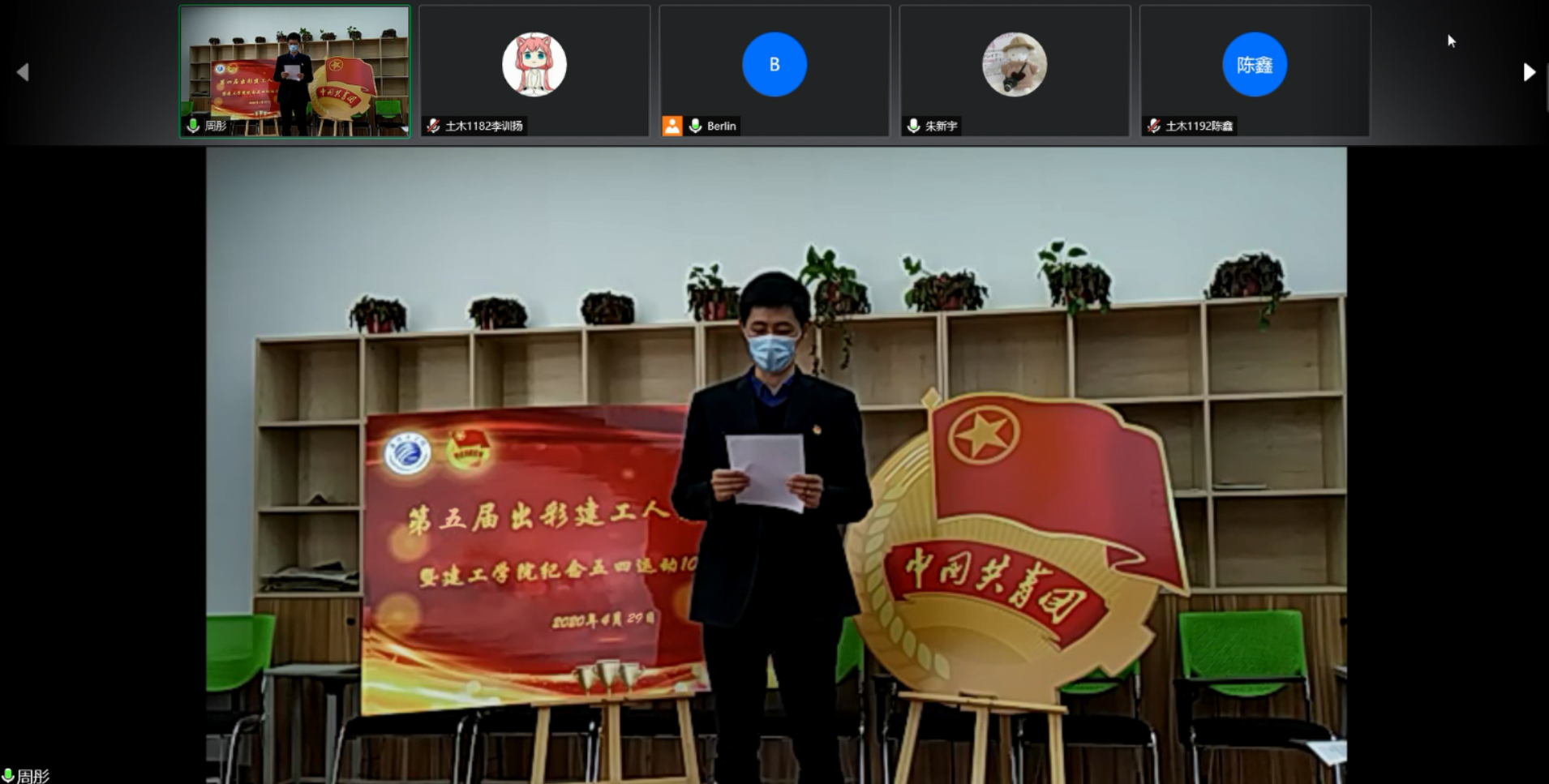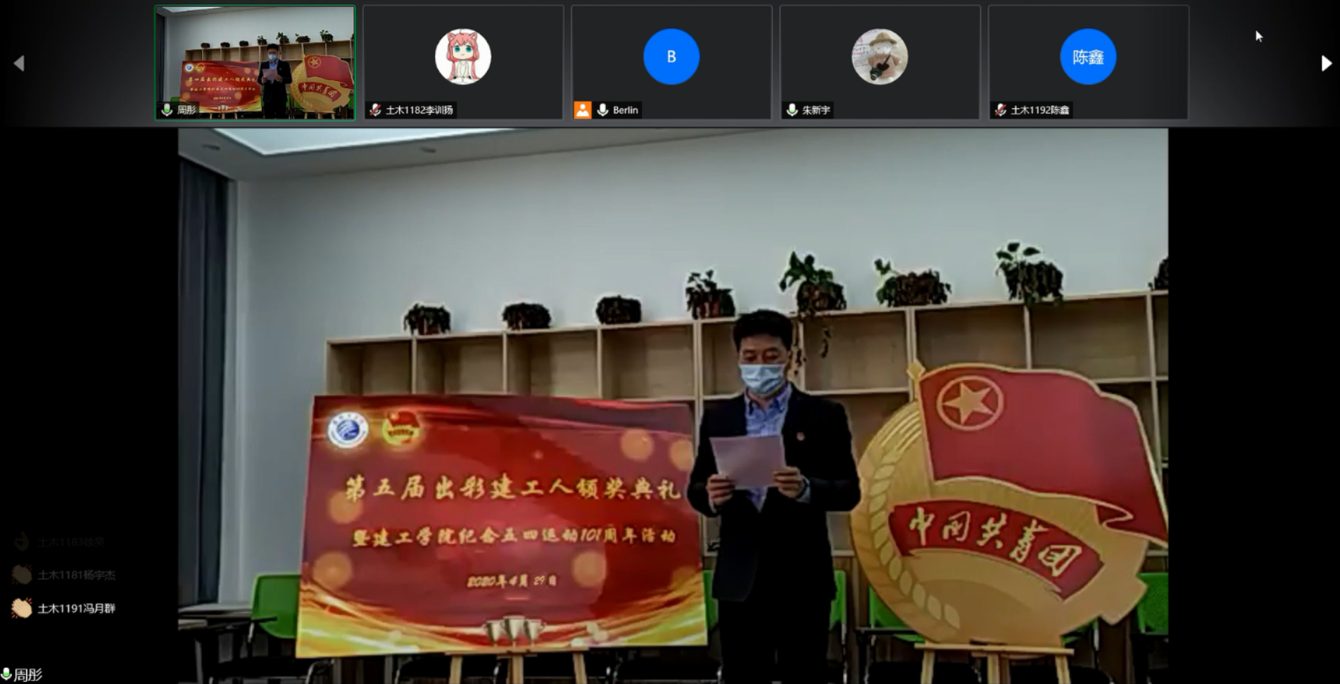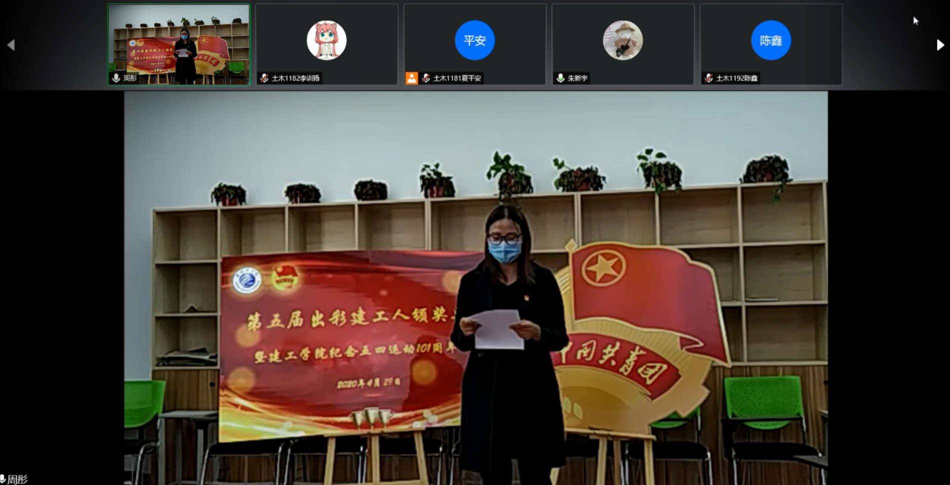 青春是一道亮丽的风景,青春是一串跳动的音符。为激发青年员工健康向上的精神风貌,增强员工的爱国热情和集体荣誉感,弘扬“五四精神”,云顶国际8588yd于4月29日下午2点30,借助腾讯会议网络平台召开第五届"出彩建工人"颁奖典礼暨纪念五四运动101周年活动。建工公司党委书记韩飞、副书记副经理陈亚东、副经理周潮、全体辅导员以及2018级、2019级全体同学参加了本次活动。
