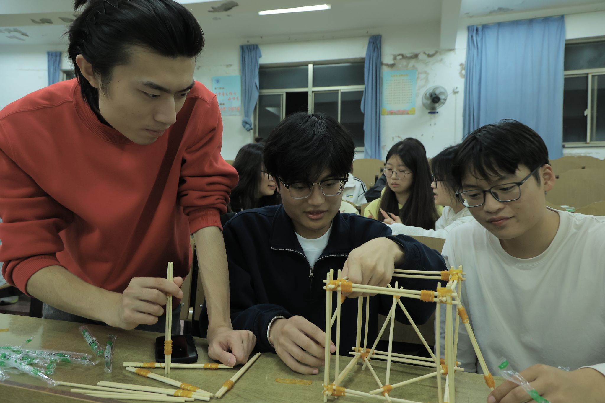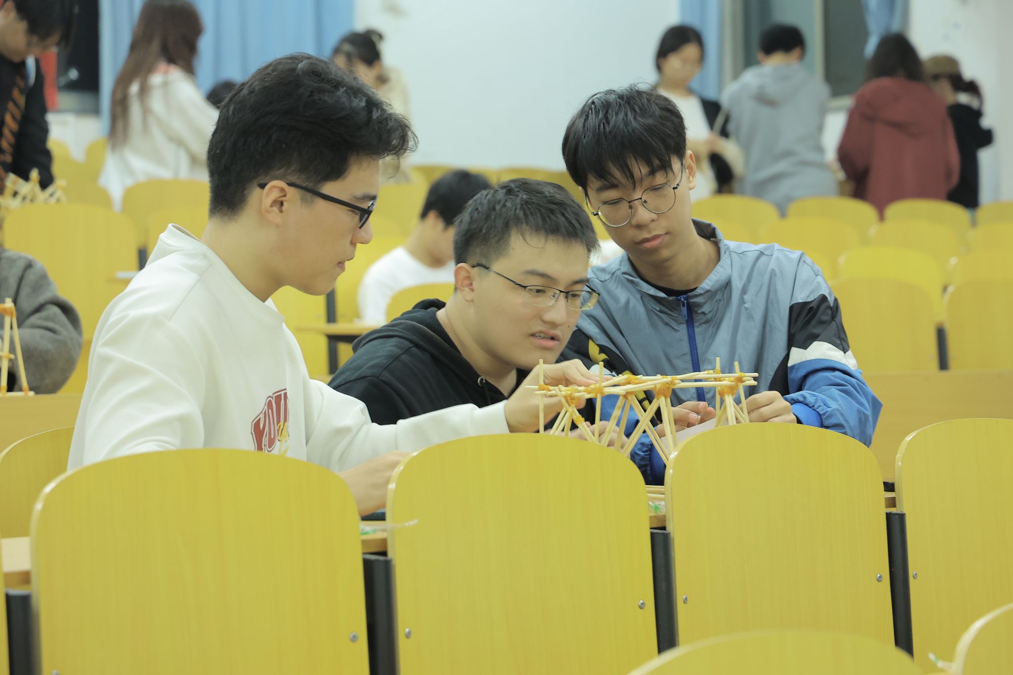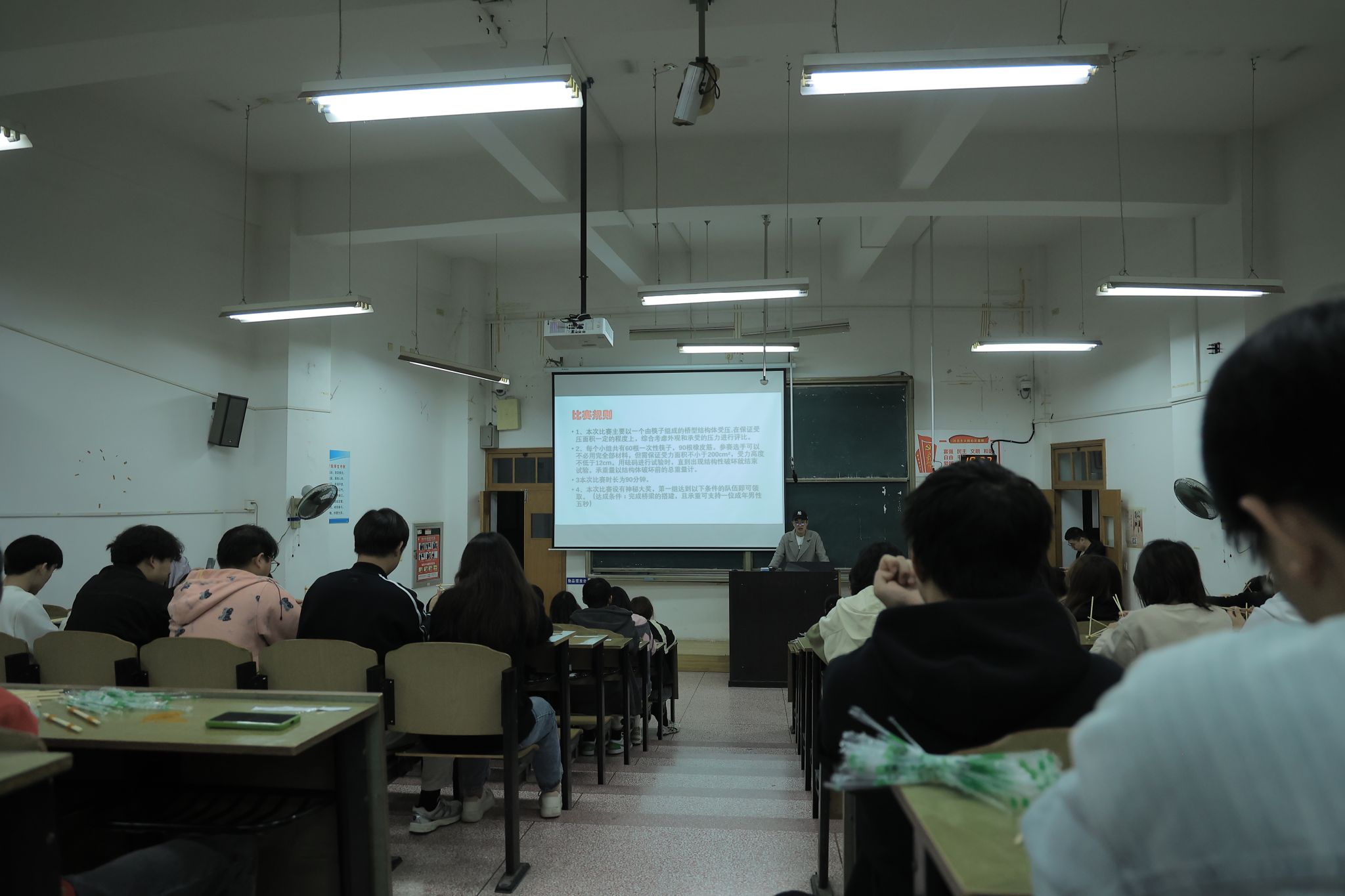 比赛在北京路校区的aj305和aj306教室拉开帷幕。参赛员工以小组为单位,组成了一支支充满活力的小队。活动开始前,陈曦老师向同学们讲解了桥梁的基本结构和力学原理,特别是三角形的稳定性在桥梁建设中的重要性,为同学们接下来的创作打下了坚实的理论基础。