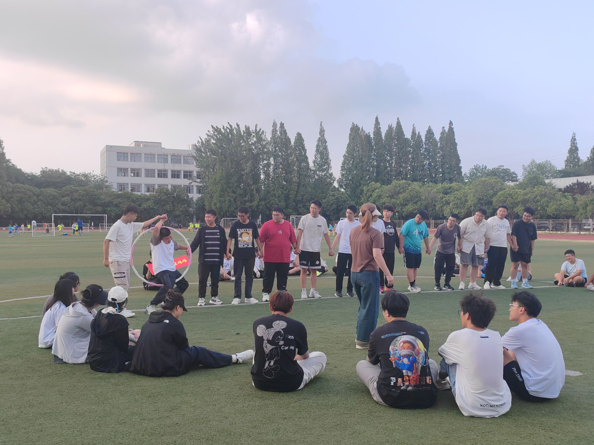 所有学员手拉手,用呼啦圈穿过所有人的身体。在活动过程中,不能以语言为沟通工具,只能依靠肢体语言和眼神进行沟通,相互拉着的手不能放开,也不能用手指去勾呼啦圈,当呼啦圈穿过所有人又回到起点,用时最短的队伍获胜。