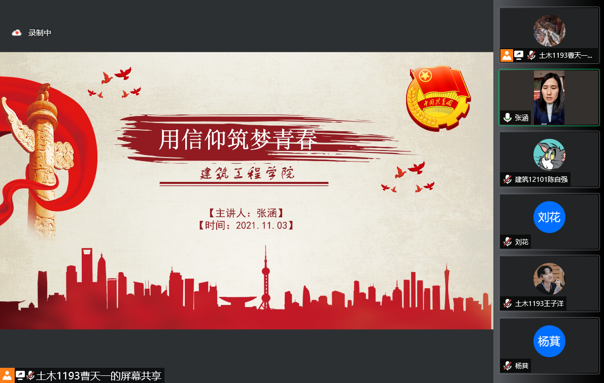 为了进一步培养当代老员工的爱国精神,增强同学对信仰的理解,2021年11月4日星期四,2021年第十九期第二讲青马工程团课,以腾讯会议的形式在线上召开,本期主讲人是云顶国际8588yd辅导员张涵老师,2021、2020、2019、2018级共63名团员参加了本次学习。