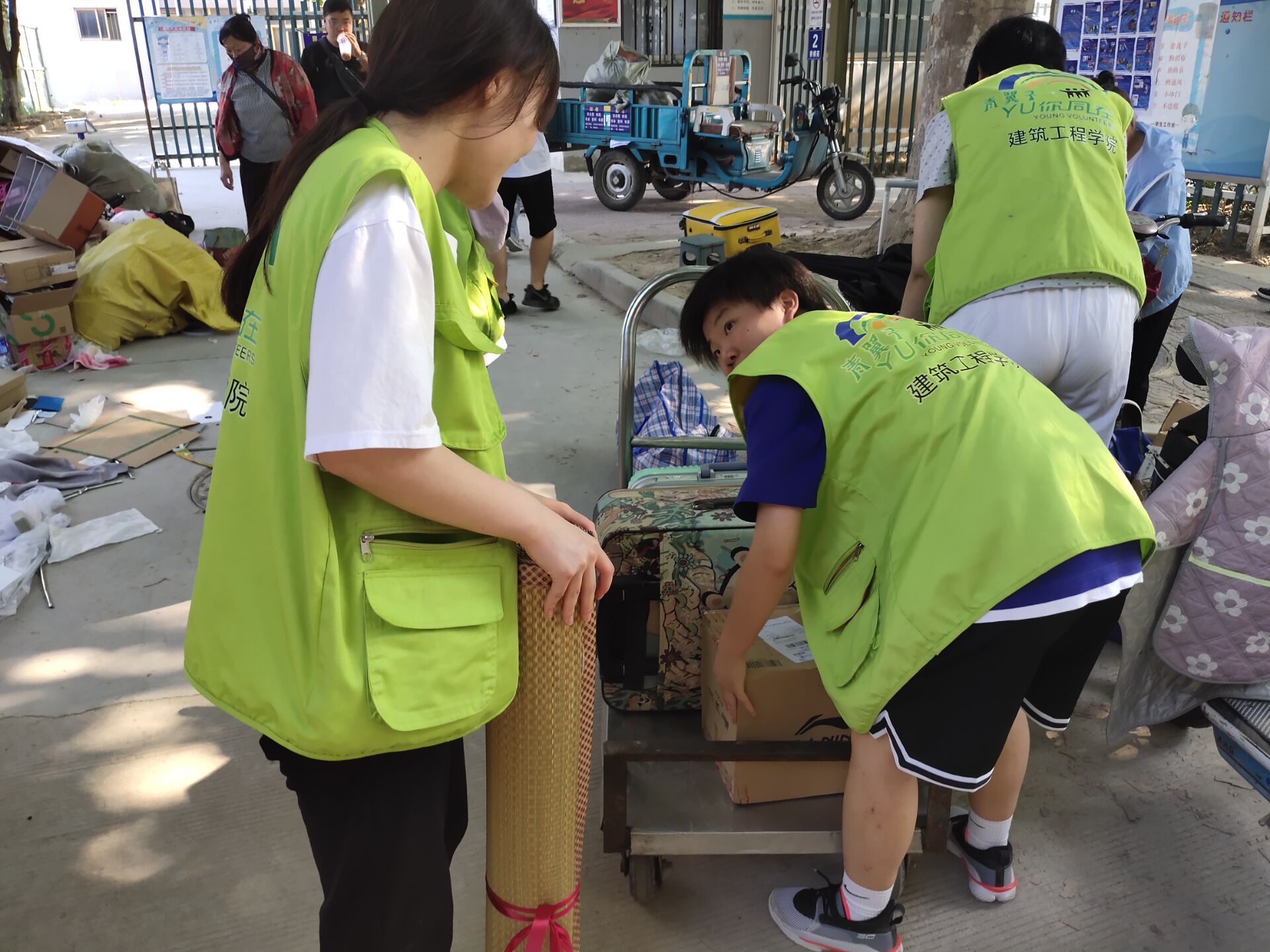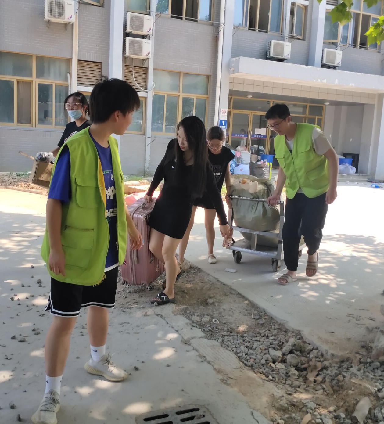 送行活动采用“三点连线”、“早中晚三班倒”的形式有条不紊地进行。在校门口设立固定联络人员,在男女生宿舍门口分设两个大本营,帮助行李送达校门口的毕业员工不计其数。青翼子志愿者们身着绿马夹,一口气将行李从宿舍搬到校门口,汗水浸透衣衫,来不及喝一口水。“青翼子与你同在”是他们的共同的口号,面带微笑、主动上前、乐于助人是他们的 “统一标配”,他们是夏日校园里最靓丽的绿色风景线。