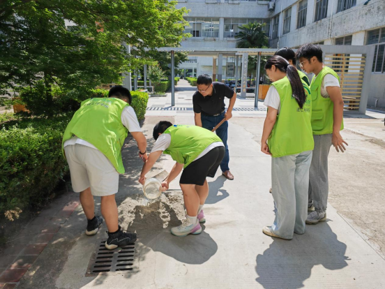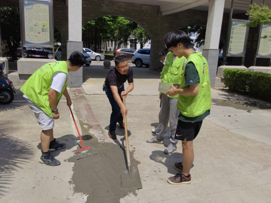 建工学子经调研发现校园地面坑洼不平,下雨天容易积水,影响车辆和行人通行,影响校容校貌。他们在专业课老师胡志军的带领下利用专业技能,用上课教学剩下的“混凝土”进行水泥地面修补,既锻炼了自己的专业实操技能又能美化校园环境。