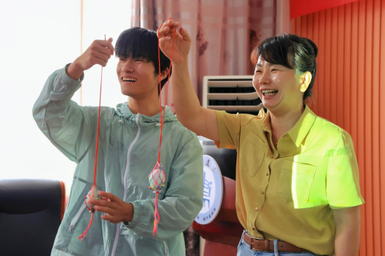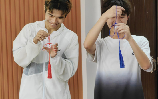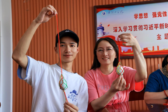 活动中,大家一起动手编织五彩手绳、缤纷鸭蛋篓、红色中国结。在这个特殊的时刻,大家用自己独特的编结技法,展示出一系列精美的作品,这些细腻而富有创意的编织作品,既体现了大家的智慧和艺术才华,也展示了中华传统文化的多元性。胡兴锋同学在展示自己动手编织的中国结时说:“中国结结身环环相扣体现的是团结,长穗体现的是文化的源远流长。” 当这些色彩斑斓的作品挂满会场时,它们不仅仅是一种装饰,更是多民族文化的象征。