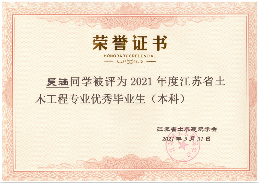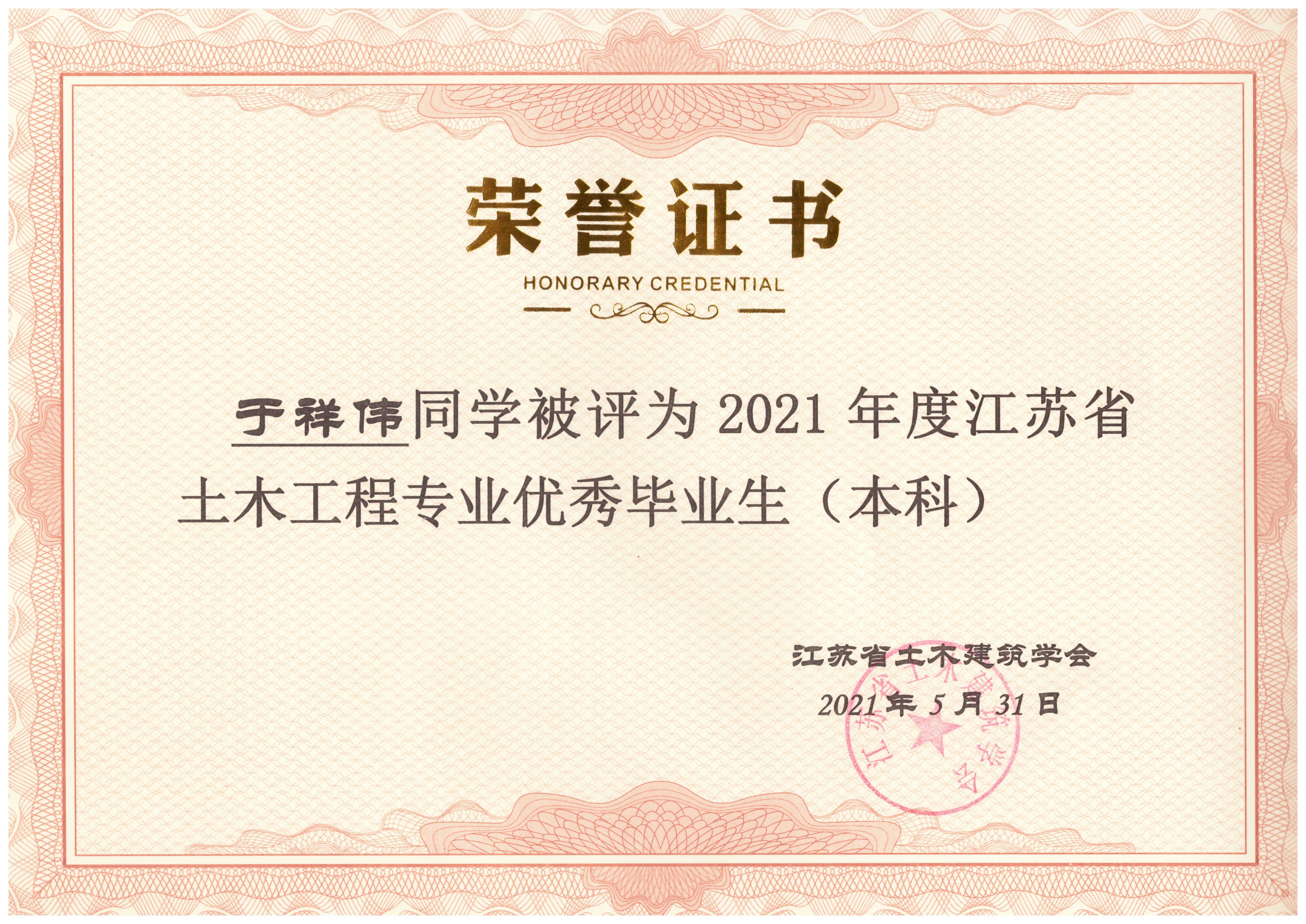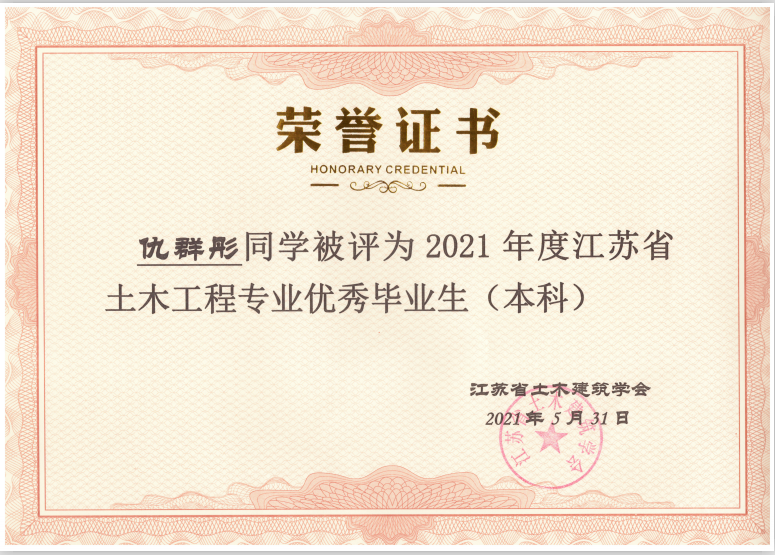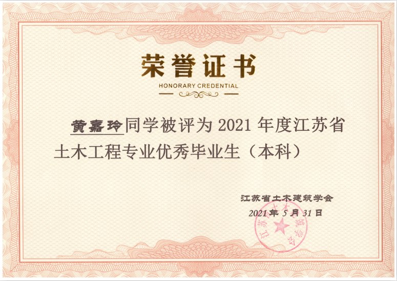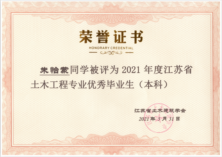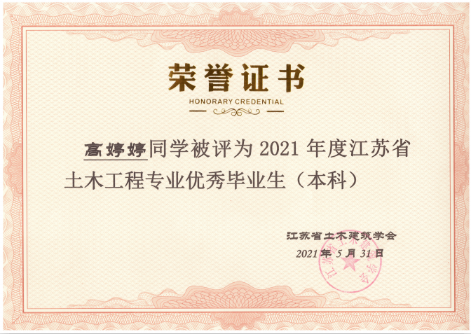 2021届本科毕业生朱怡蒙、于祥伟、吴涵、姜骜鹏、仇群彤、高婷婷、黄嘉玲等7位同学荣获2021年“江苏省土木工程优秀毕业生”称号。
