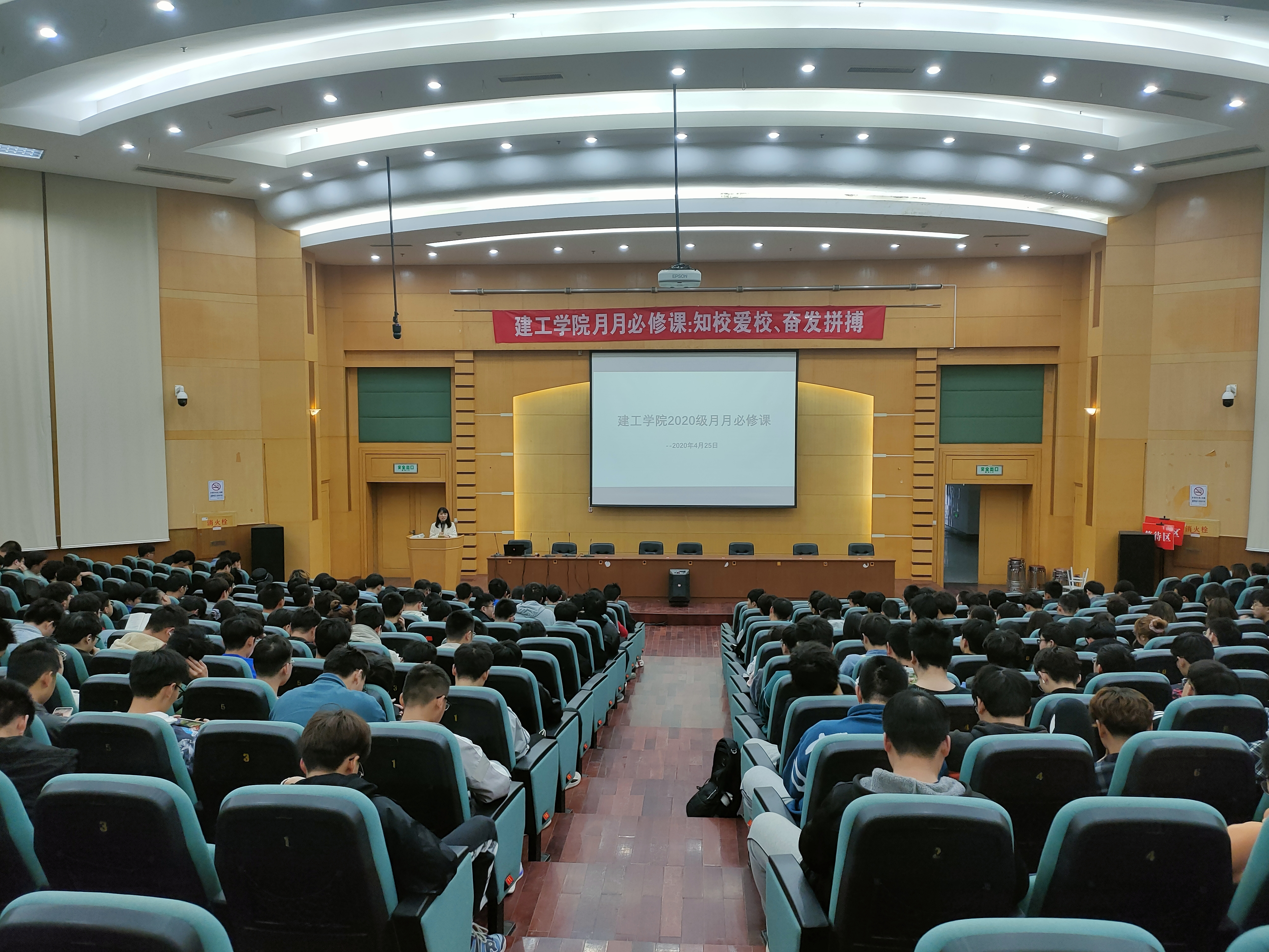 2021年4月25日晚6点30分,云顶国际8588yd在尚学楼报告厅举办主题为“知校爱校、奋发拼搏”的月月必修课。建工公司党委副书记冯云平、优秀员工代表姜云涛、于祥伟,以及2020级全体员工参加了本次活动。