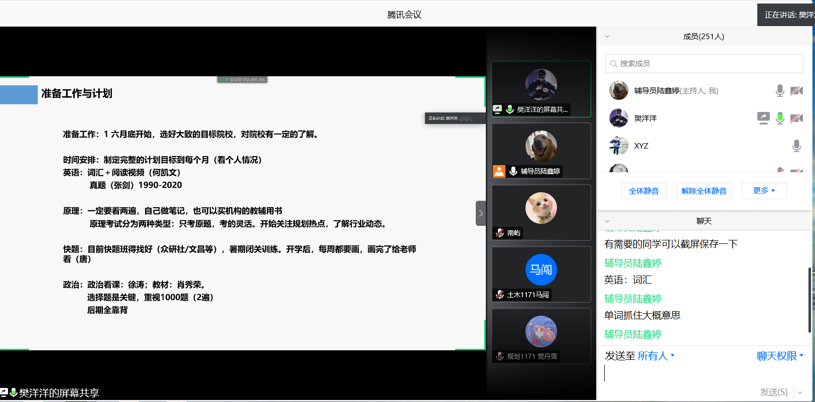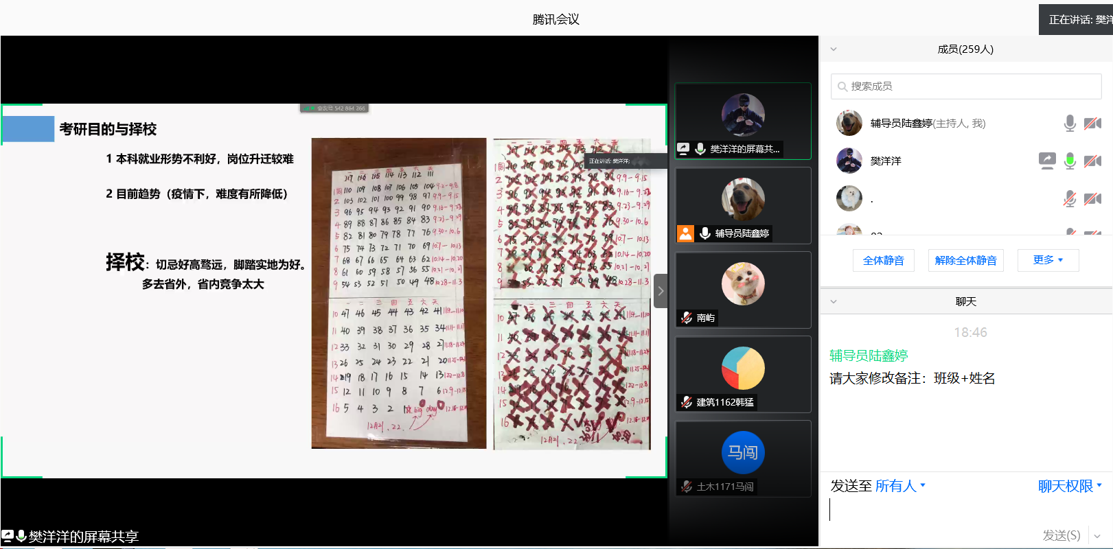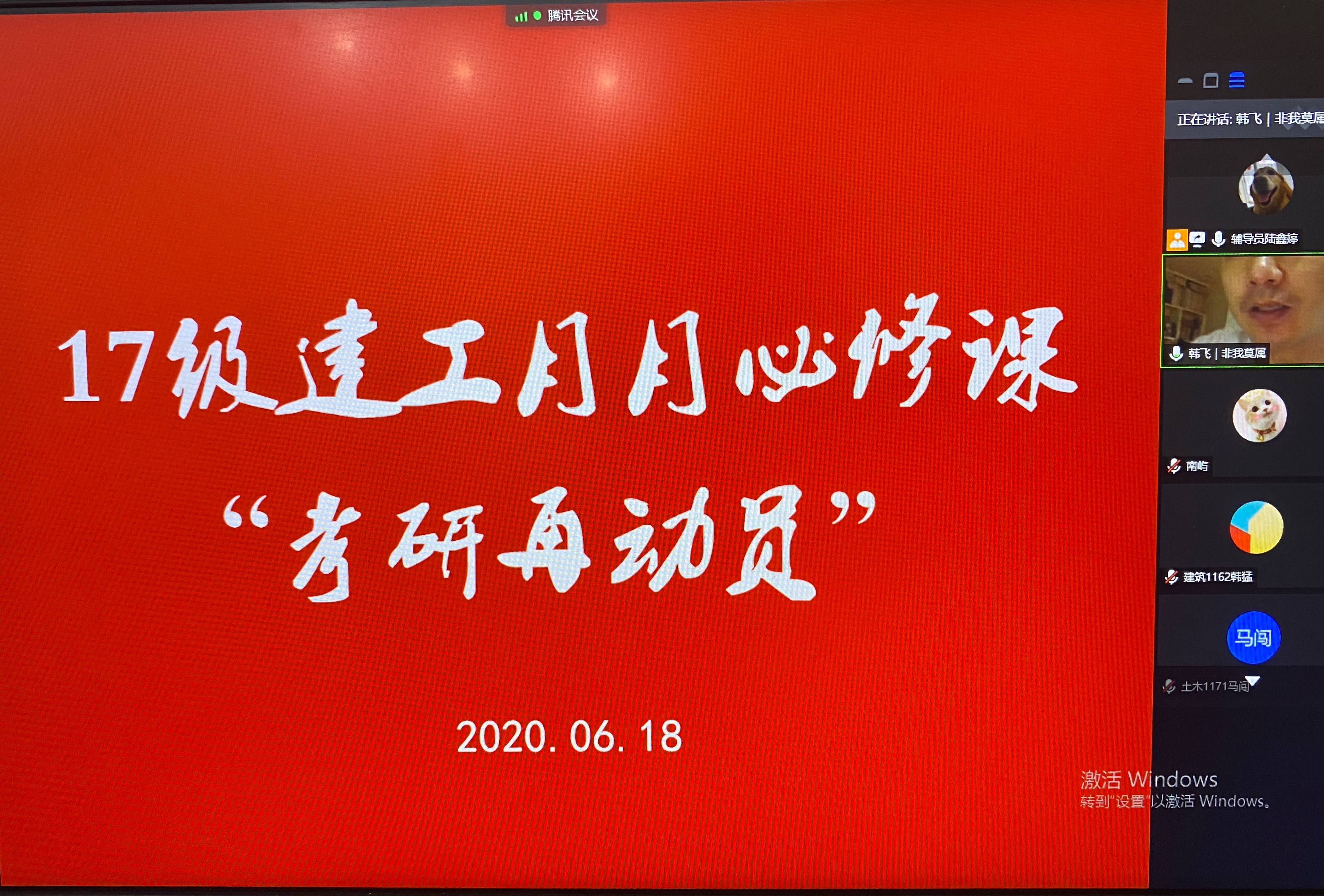 2020年6月18日晚7点,云顶国际8588yd“月月必修课”:2017级考研再动员在腾讯会议和钉钉平台线上举行会,建工公司党委书记韩飞、2020届毕业生风景1161钱柯岑,规划1161樊洋洋,城地1161邓伟和2017级全体同学参加必修课,必修课由2017级辅导员陆鑫婷主持。