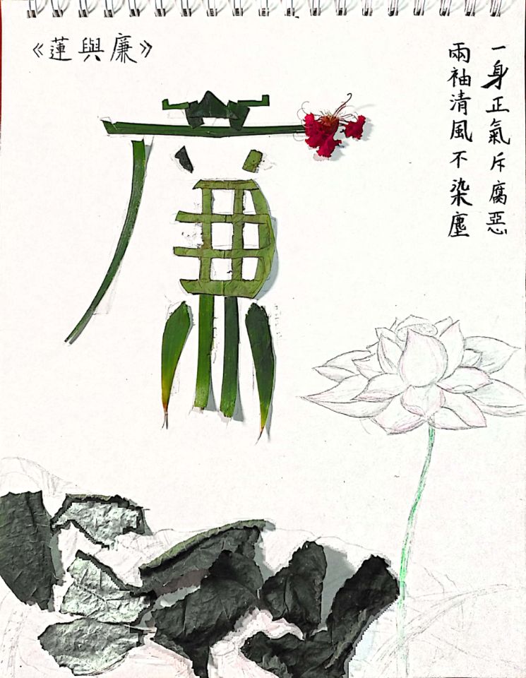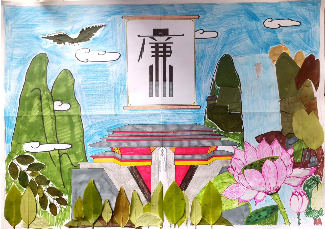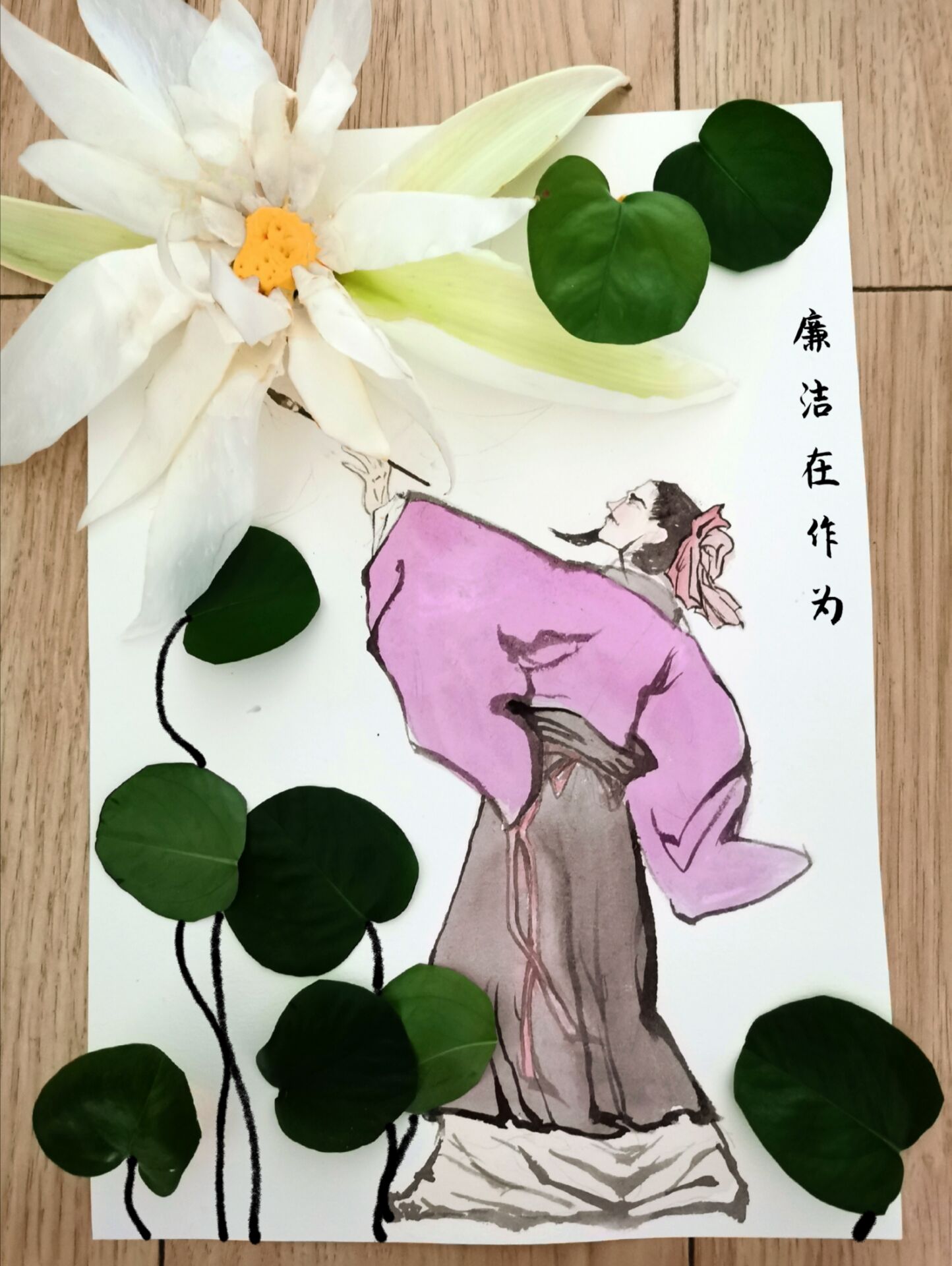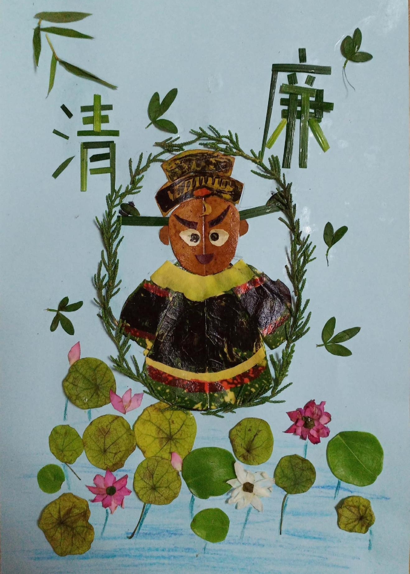 此次活动正值夏日炎炎,暑期在家的同学们踊跃参与,通过对廉洁之风的深刻思考和深入理解,将树叶和绘画优美的融合在一起,一片片翠绿的荷叶,一朵朵洁白无瑕的莲花,一笔笔流畅的线条,创作出了形式各异、意义深刻的优秀作品。作品《北宋名臣包青天》展示了一位一生内心正直、廉洁公正、不附权贵、铁面无私且英明决断、敢于替百姓申不平的父母官,是廉洁形象的代表人物。作品《莲与廉》的寓意是二字都有lian的音,继而将二者联系在一起,廉洁的人,正具有莲花一般美好的品质,正直,不沾染恶俗。画中的廉字形状是一位官,寄寓了对有权位的当政者刚正不阿的期望。
