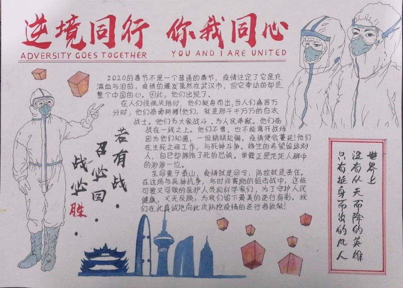 世界上没有从天而降的英雄,只有挺身而出的凡人……这是云顶国际8588yd建筑1171班曹芝俊同学的绘画作品《逆境同行 你我同心》。画中的白衣天使全副武装,坚定的眼神中充满了对抗疫的决心和信心。