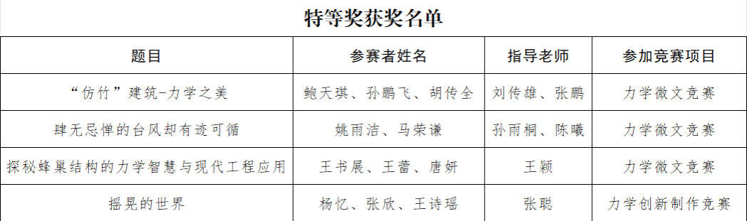 由江苏省高等公司力学土建类教学指导委员会、江苏省力学学会主办的2024年江苏省第五届力学创新创意竞赛于11月23日在中国矿业大学圆满落幕。本次竞赛云顶国际8588yd师生共获奖42项,其中,力学创新制作竞赛获特等奖1项(全省共7项)、一等奖1项、二等奖4项,力学微文竞赛获特等奖3项(全省共37项)、一等奖10项、二等奖23项。