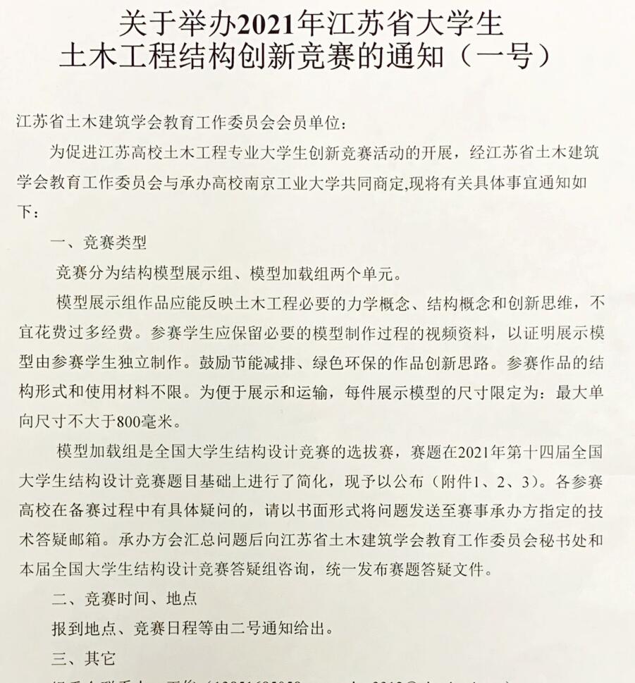 请各位老师,同学积极组队参与竞赛,详细通知根据江苏省详见:土木工程结构创新竞赛的通知(二号)。