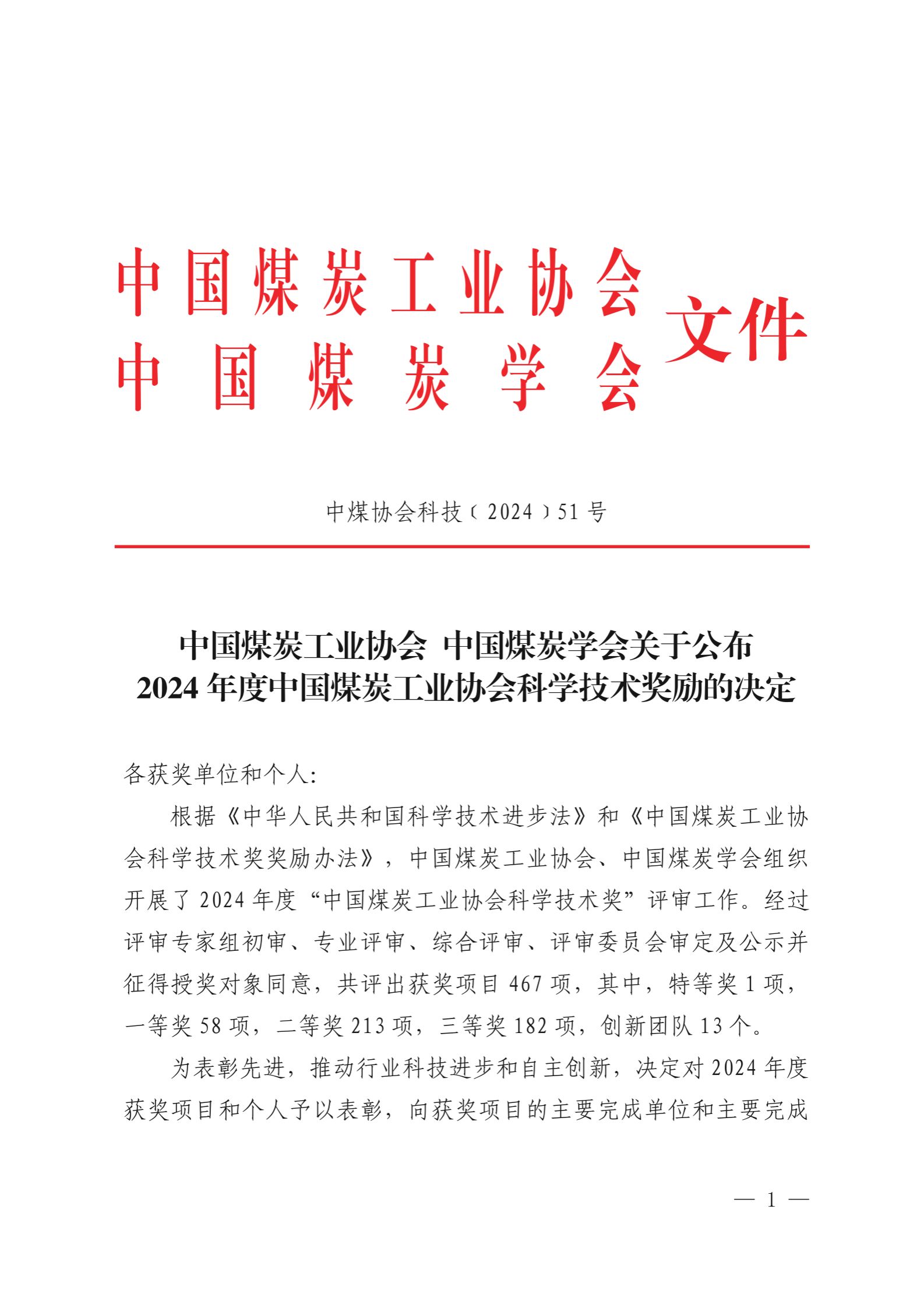 中国煤炭工业协会是拥有国家科技奖直接推荐权的国家一级协会,“中国煤炭工业协会科学技术奖”是经国家科技部批准备案,中国煤炭工业协会组织开展的全国煤炭行业科技奖。经过评审专家组初审、专业评审、综合评审、评审委员会审定及公示并征得授奖对象同意,共评出获奖项目467项,其中,特等奖1项,一等奖58项,二等奖213项,三等奖182项,创新团队13个。