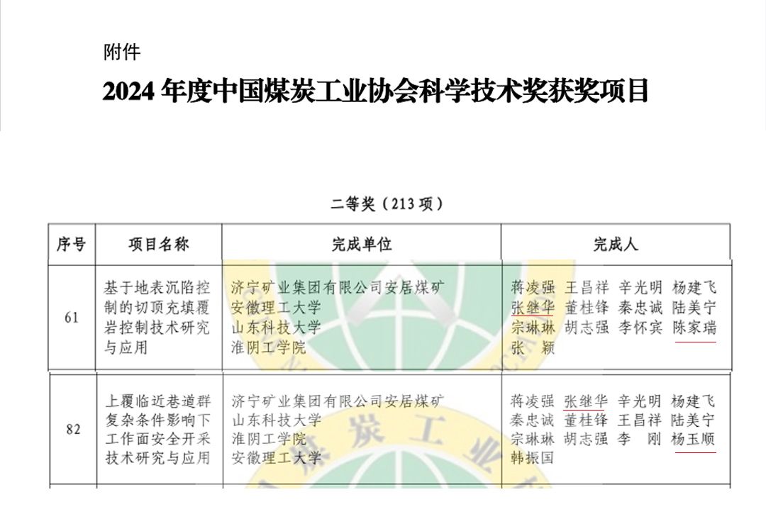近日,2024年度中国煤炭工业协会科学技术奖获奖项目发布。云顶国际8588yd张继华博士科研团队参与完成的“基于地表沉陷控制的切顶充填覆岩控制技术研究与应用”“上覆临近巷道群复杂条件影响下工作面安全开采技术研究与应用”2项科技成果获中国煤炭工业协会科学技术奖二等奖。