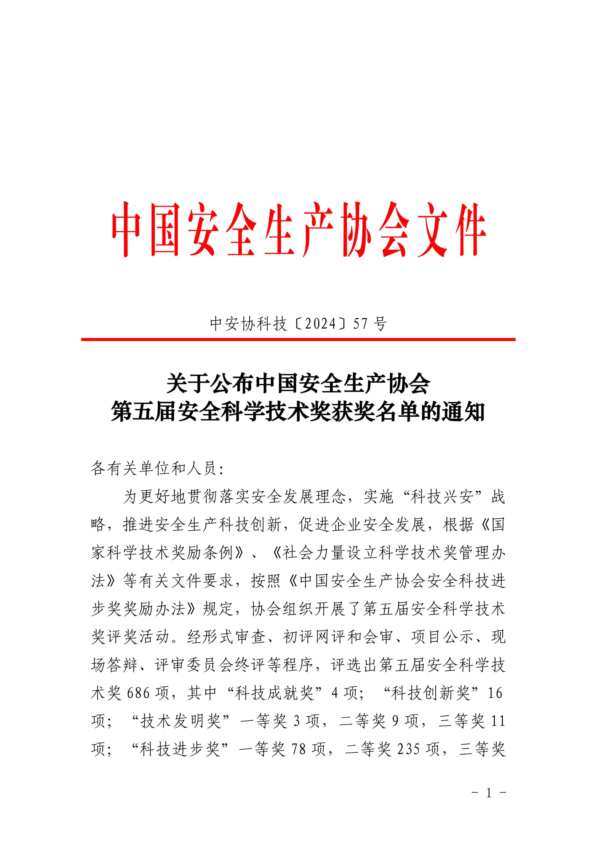 中国安全生产协会安全科技进步奖是经国家科学技术奖励办公室批准设立的安全生产领域唯一全国性的安全科技奖项。奖励在安全生产领域中为基础理论和管理方法研究、技术标准制定、科学技术发明、科技成果研发和转化、设施设备技术改造和创新等工作中做出突出贡献的单位和个人。据悉,本次经形式审查、初评网评和会审、项目公示、现场答辩、评审委员会终评等程序,共评选出第五届安全科学技术奖686项,其中“科技成就奖”4项;“科技创新奖”16项;“技术发明奖”一等奖3项,二等奖9项,三等奖11项;“科技进步奖”一等奖78项,二等奖235项,三等奖330项。