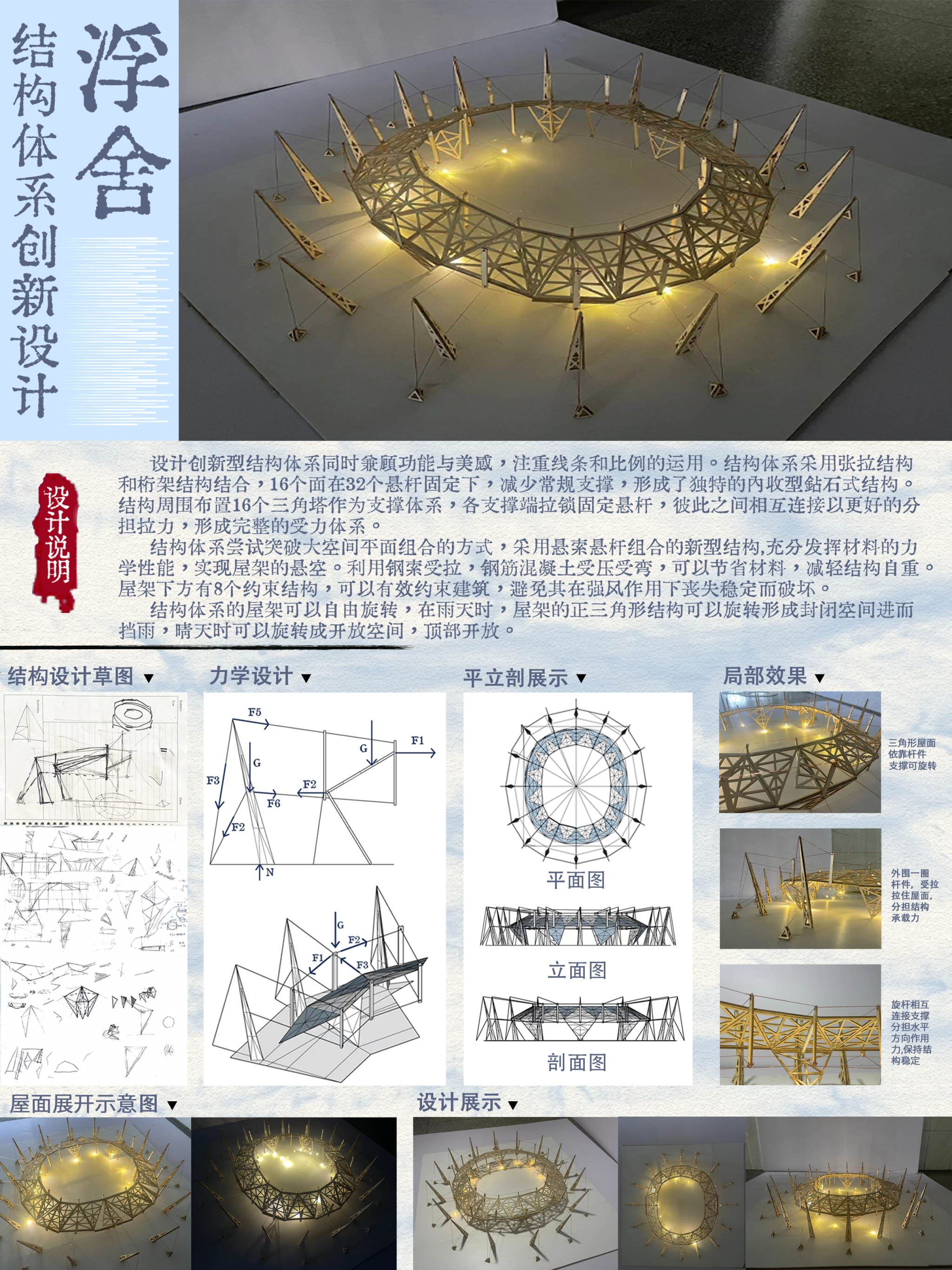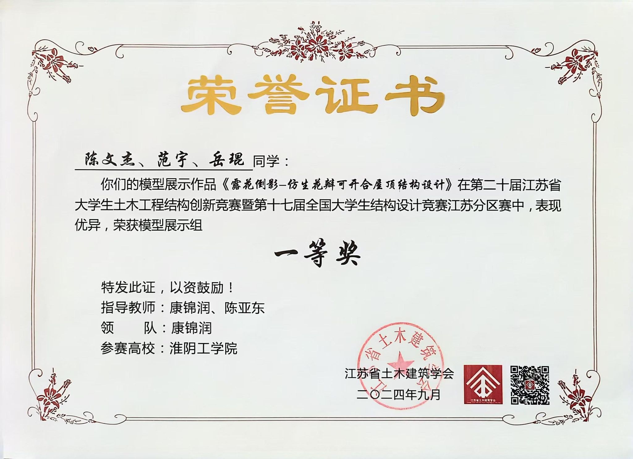 近期,2024年江苏省老员工土木工程结构创新竞赛暨第十七届全国老员工结构设计竞赛江苏分区赛在常州大学举行。来自东南大学、河海大学、南京工业大学、陆军工程大学、中国矿业大学、南京航空航天大学、南京理工大学等全省33个高校52支队伍开展了题为《考虑水平振动的高耸塔式结构设计与模型制作》竞赛,38支队伍开展了以“节能、创新”为主题的模型展示组竞赛。公司代表队获得模型展示组一等奖和二等奖各1项,模型加载组二等奖1项的优异成绩。公司陈文杰、范宇、岳琨同学制作的作品“露花倒影”(指导教师:康锦润、陈亚东)获得展示组一等奖;戴州、吴范逸冰、张鑫同学制作的作品“浮舍”(指导教师:陈萍、彭宁波)获得展示组二等奖;刘晨昊、王健、陈可楠同学组成的团队(指导教师:朱鹏宇张卫东)获加载组二等奖。