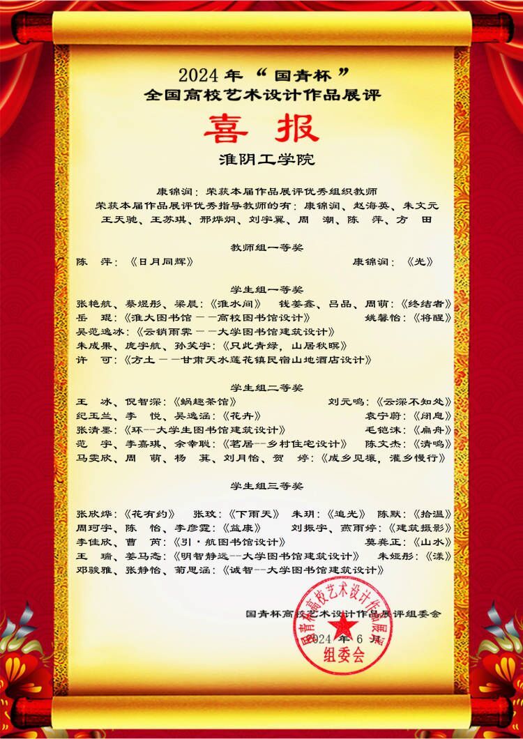 康锦润老师创作的《光》、陈萍老师创作的《日月同辉》获得教师组一等奖,钱姜鑫、吕品、周萌创作的《终结者》与张艳航、秦煜彤、梁晨创作的《淮水间》等获得员工组一等奖。此外,王冰、倪智深创作的《蜗趣茶馆》,马雯欣、周萌、杨其、刘月怡、贺婷创作的《成乡见壤,灌乡慢行》与王瑞、姜马念创作的《明智静远——大学图书馆建筑设计》等作品也分别荣获员工组二等奖和三等奖。