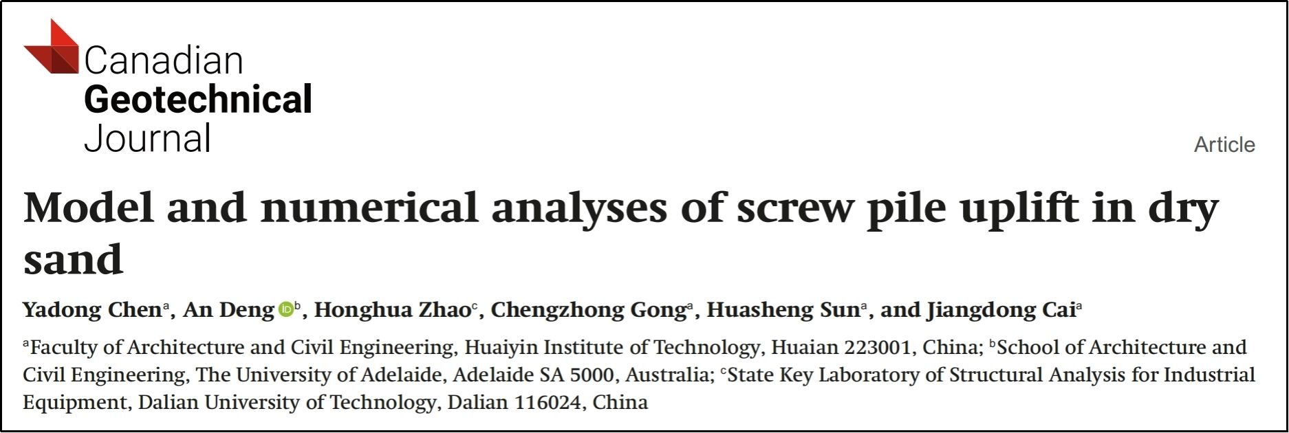 近日,岩土工程领域国际三大顶级期刊之一的Canadian Geotechnical Journal发表了公司陈亚东教授团队的研究成果“Model and numerical analyses of screw pile uplift in dry sand”。据悉,这是公司首次以第一单位和第一作者在该刊物上发表论文。