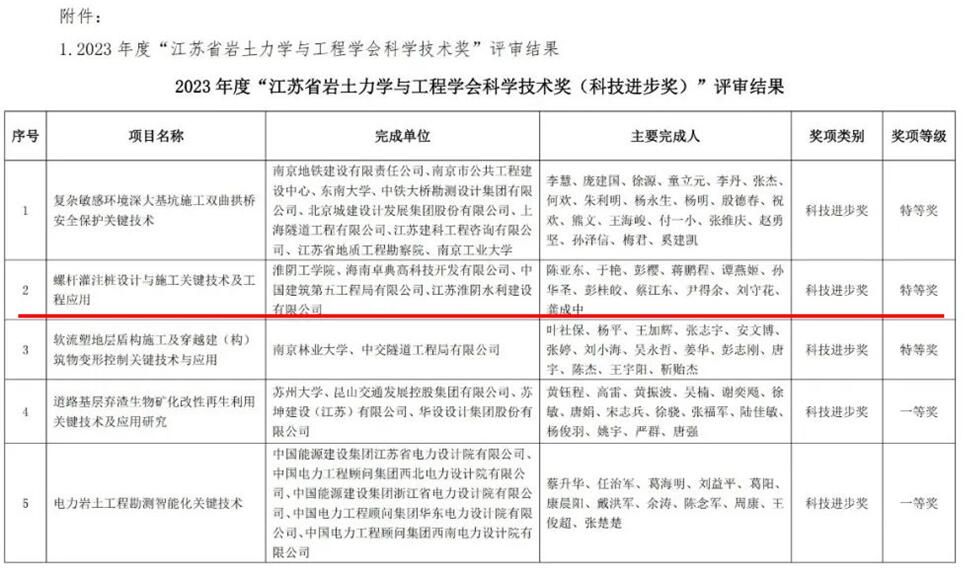 11月23日,江苏省岩土力学与工程学会公示了2023年度“江苏省岩土力学与工程学会科学技术奖”评审结果,陈亚东经理牵头申报的“螺杆灌注桩设计与施工关键技术及工程应用”获得科学技术奖特等奖,这表明公司科学研究水平持续提升、社会贡献度和行业影响力不断提高。