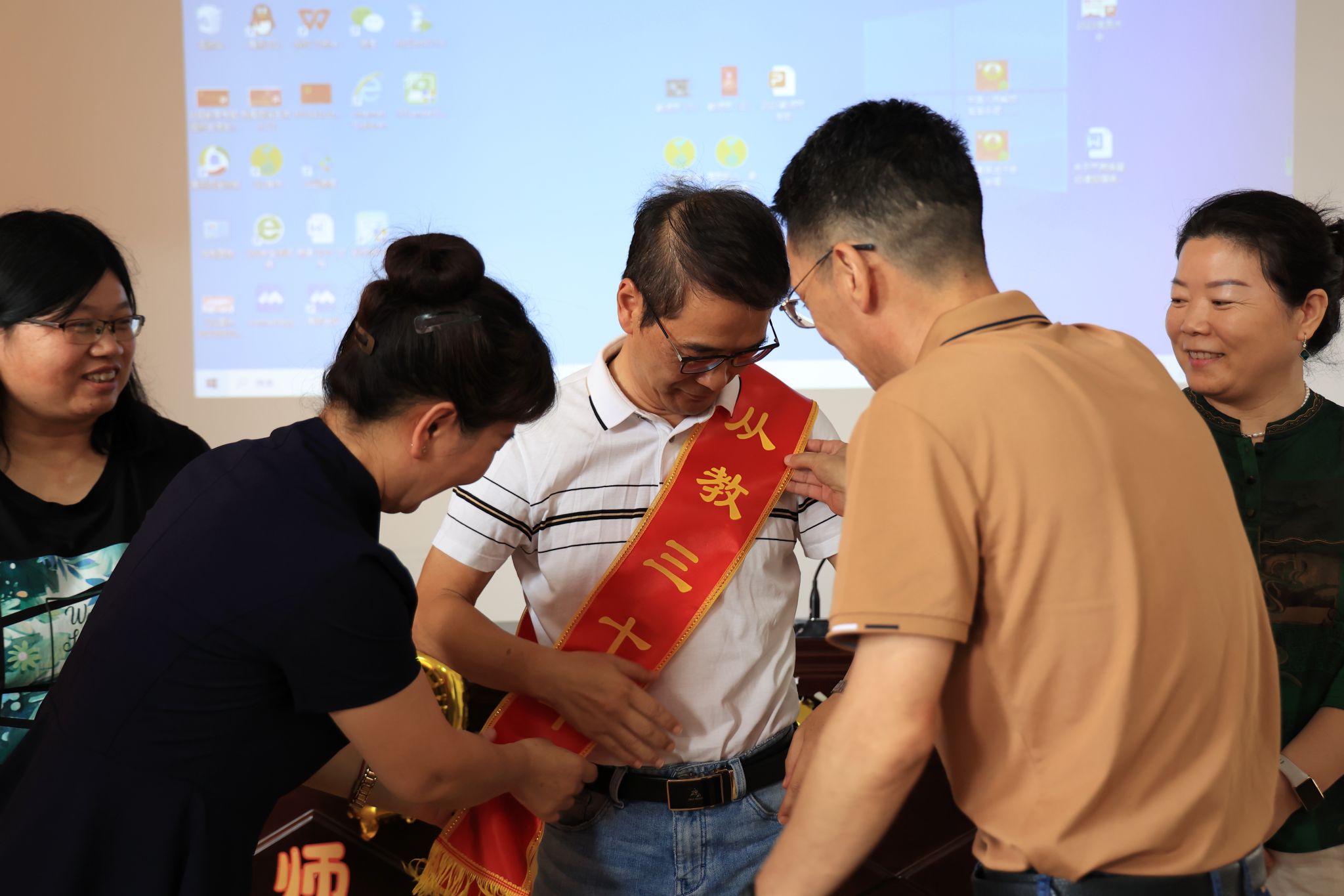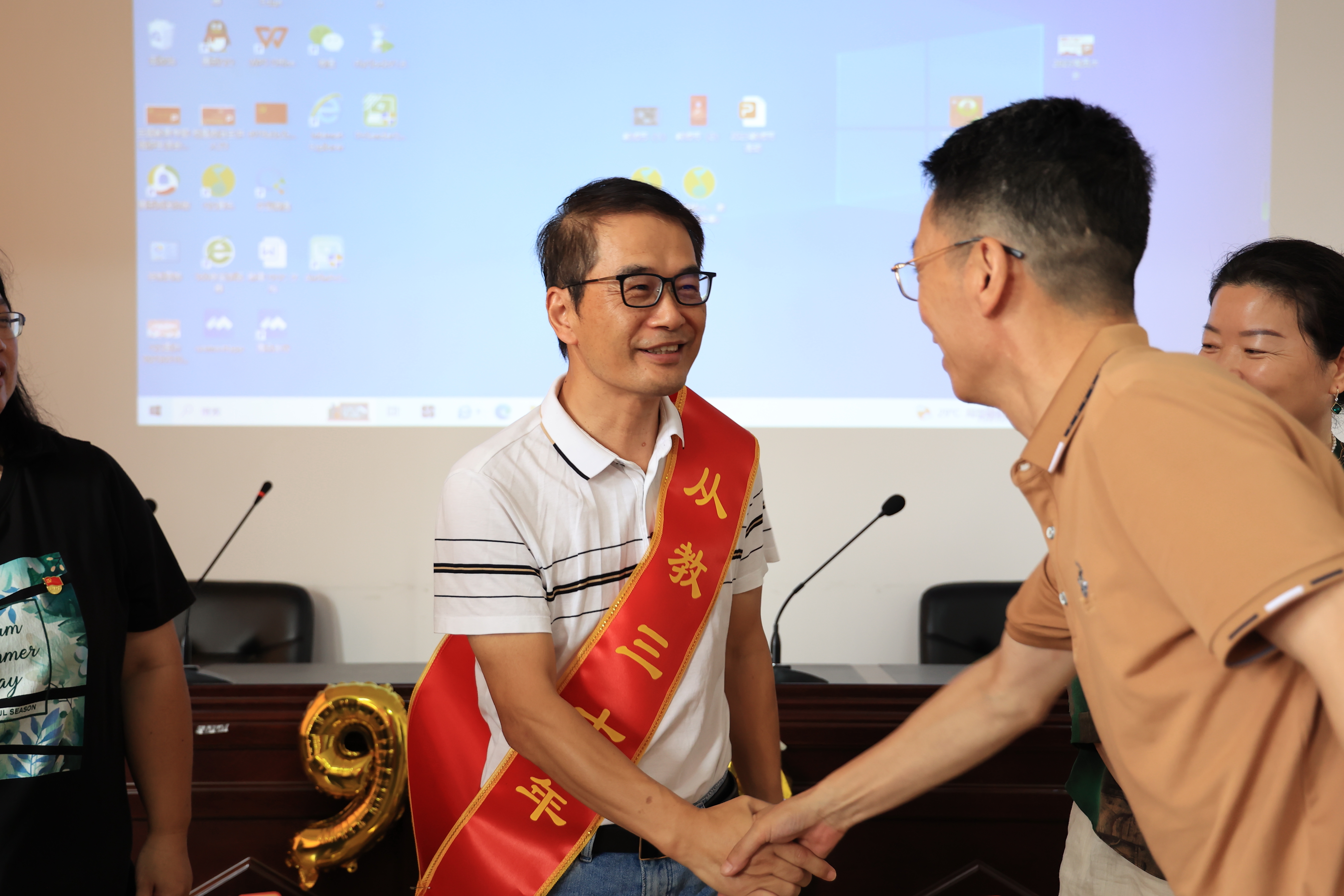 公司为从教30年的王建林老师和从教20年的张小侠、赵海英老师献上鲜花和绶带。王建林老师说:“如果时光倒退30年,我还是会选择淮工云顶国际8588yd。”“开心、感谢”是张小侠老师执教二十年最深的感触。一声“海英姐”给予了赵海英老师源源不断的动力。老教师们用行动践行了“一生只为一件事”,诠释了“爱是教育的灵魂”,在场所有教师用热烈的掌声为他们点赞。