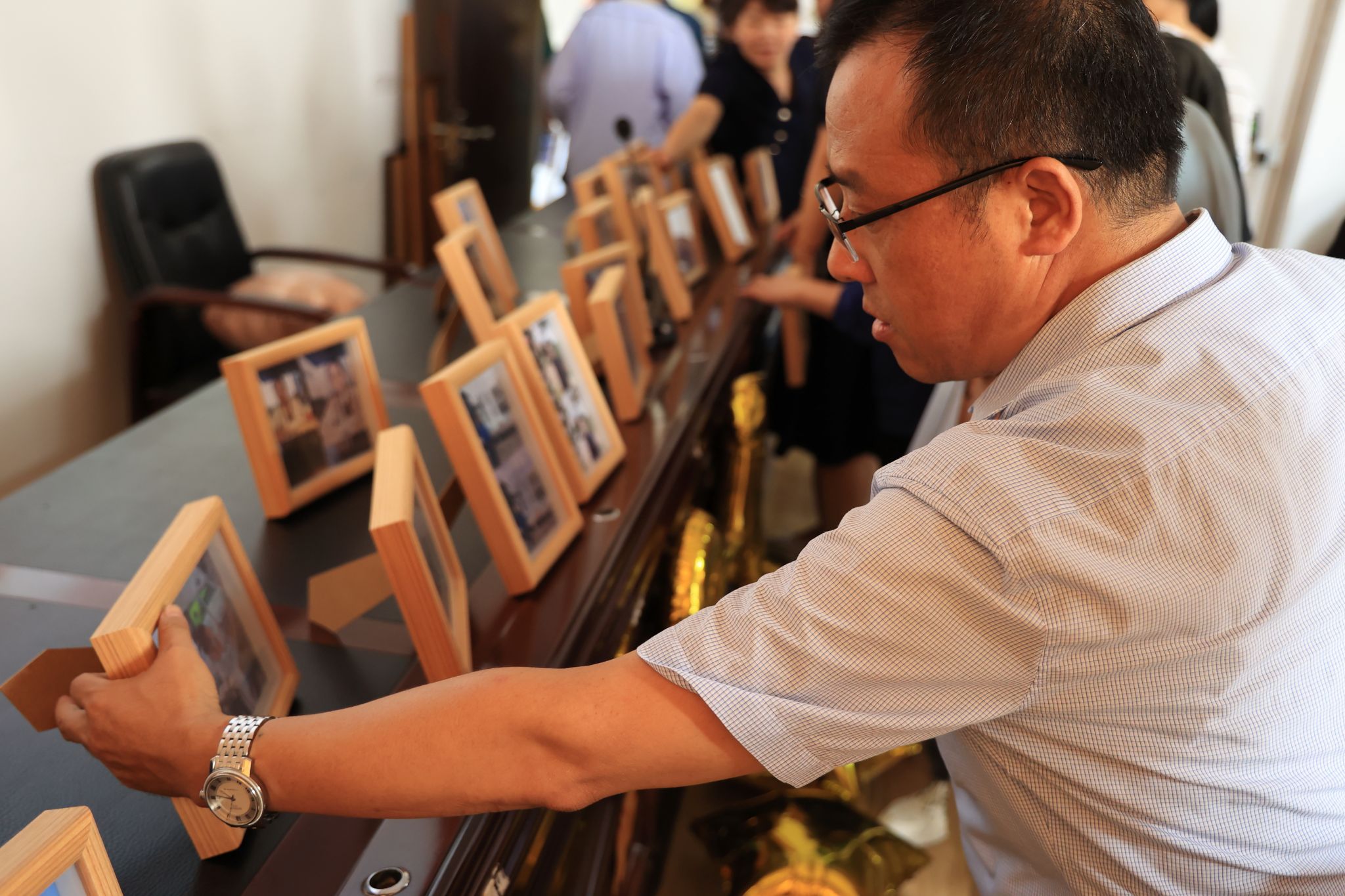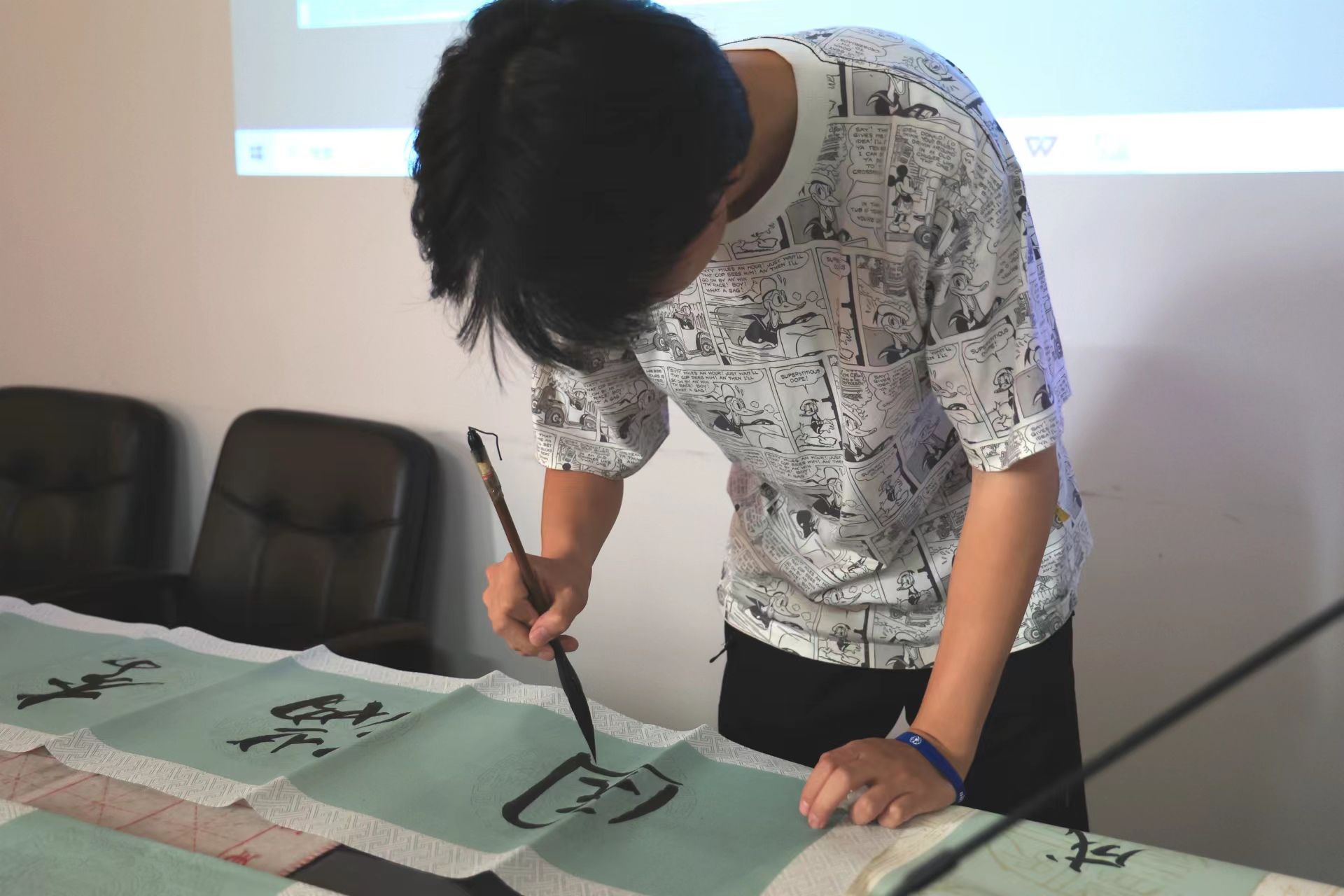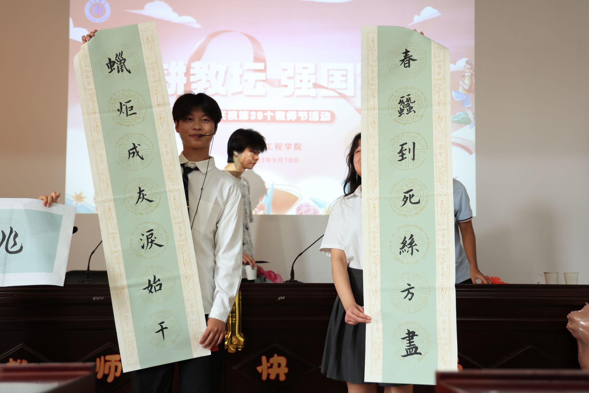 “初入淮工,青涩懵懂,一路成长,幸赖良师”,院艺术团特意原创了《九月的诗》诗歌献给老师。更有两位同学伴随着诗朗诵的声音,现场用毛笔书法表达对老师的感恩和敬意。同学们热情洋溢的朗诵和笔酣墨饱的毛笔书法赢得了全体教师的掌声。此外,同学们还录制了祝福视频,用一曲《爱我的人 谢谢你》再次表达了同学们对老师的真挚情感。伴随着歌声,老师们收到了为其私人定制的手绘照片,将美好的任教岁月定格在相框中。