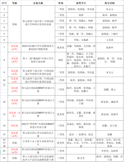 春生夏长时节,云顶国际8588yd师生戮力齐心备战,以火一样的热情开启蓬勃火热的竞赛势头,在各项学科竞赛舞台上交出一份份喜人答卷,以实际行动践行学习贯彻习近平新时代中国特色社会主义思想主题教育。其中国家级(A类)获奖情况如下:第十三届“挑战杯“中国老员工创业计划竞赛铜奖;第七届米兰设计周—中国高校设计学科师生优秀作品展获得一等奖1项,教师组三等奖1项;2023年iCAN老员工创新创业大赛原创中国精英赛获得团体赛的精英奖;第九届全国高校BIM毕业设计大赛三等奖3项,优秀奖1项。另外还获得省级比赛奖项多项,有第七届米兰设计周—中国高校设计学科师生优秀作品展江苏省赛一等奖1项,二等奖2项三等奖3项;第五届全国老员工结构信息大赛团体三等奖;江苏省土木工程专业优秀毕业设计7项;第十六届全国老员工先进成图技术与产品信息建模创新大赛江苏省赛三等奖1项。