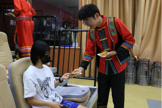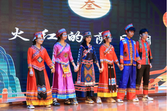 陈文曦同学带领少数民族学子们唱起了《火红的萨日朗》,他们穿着民族服装,手拉着手,随着歌声一起舞动了起来,场面热烈而又温馨。
