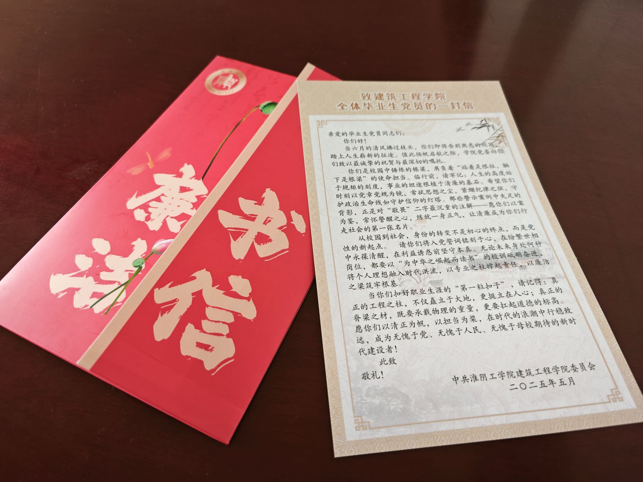 毕业生党员代表纷纷表示,这堂离校前的廉洁教育“第一课”深刻难忘。夏书记的谆谆教诲与“廉洁书信”更是珍贵的临别赠礼。大家郑重承诺,必将铭记党员身份,传承红色基因,恪守廉洁底线,以坚定的信念、过硬的本领和清廉的作风,在未来的岗位上拼搏奉献,展现淮工建工党员的良好风貌,不负时代重托。
